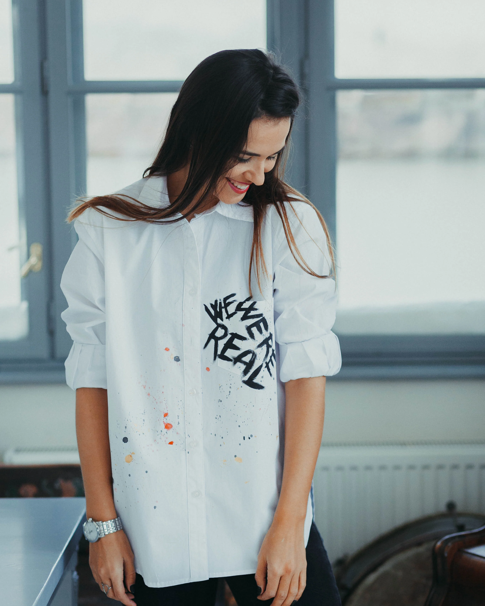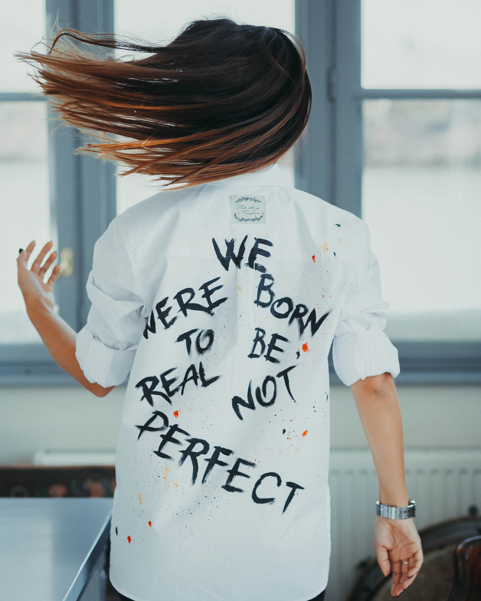 Women's cotton shirt, personalized "We were born to be real", has long sleeves and a button fastening. It can easily blend into any up-to-date, sophisticated and...so chic outfit.
