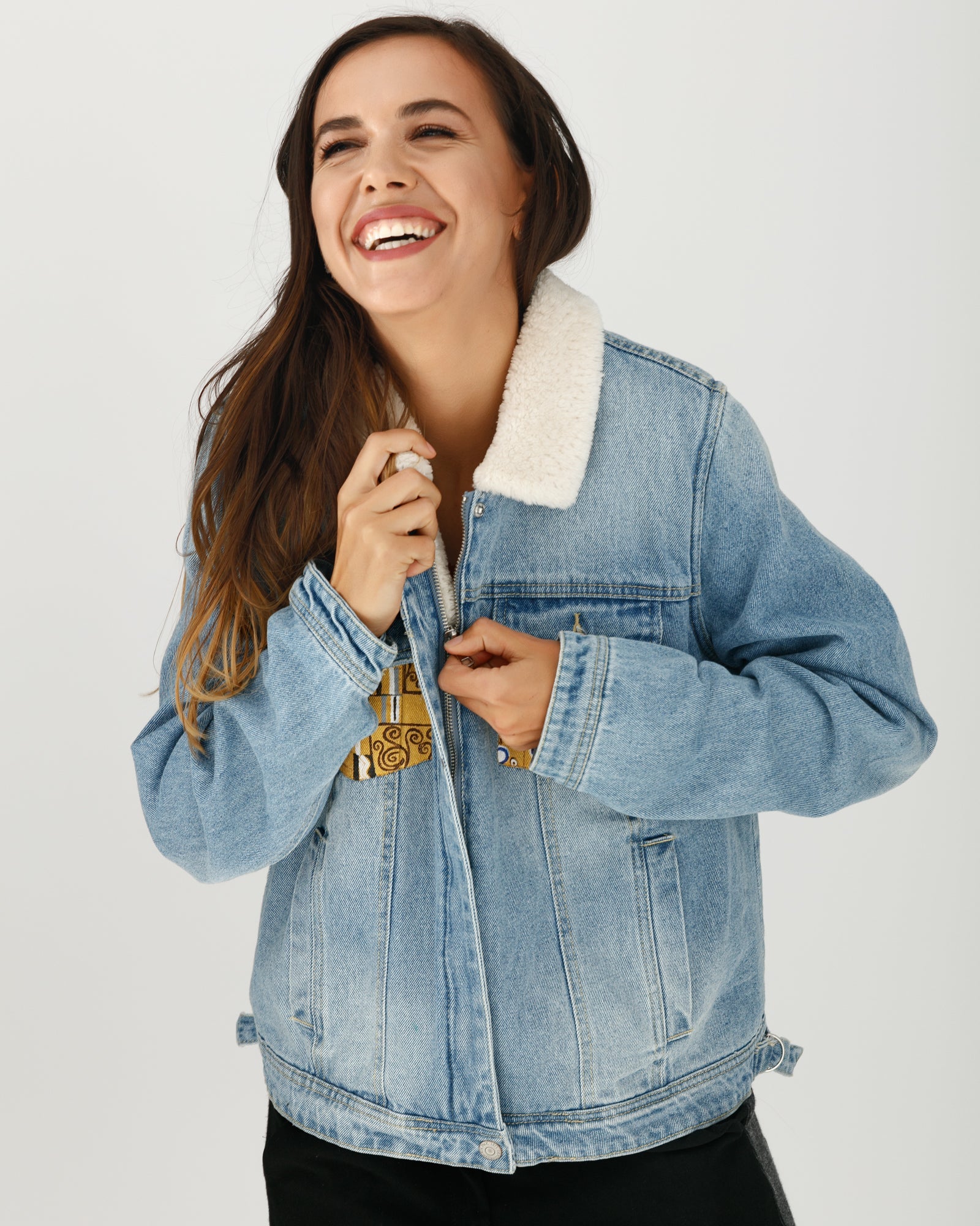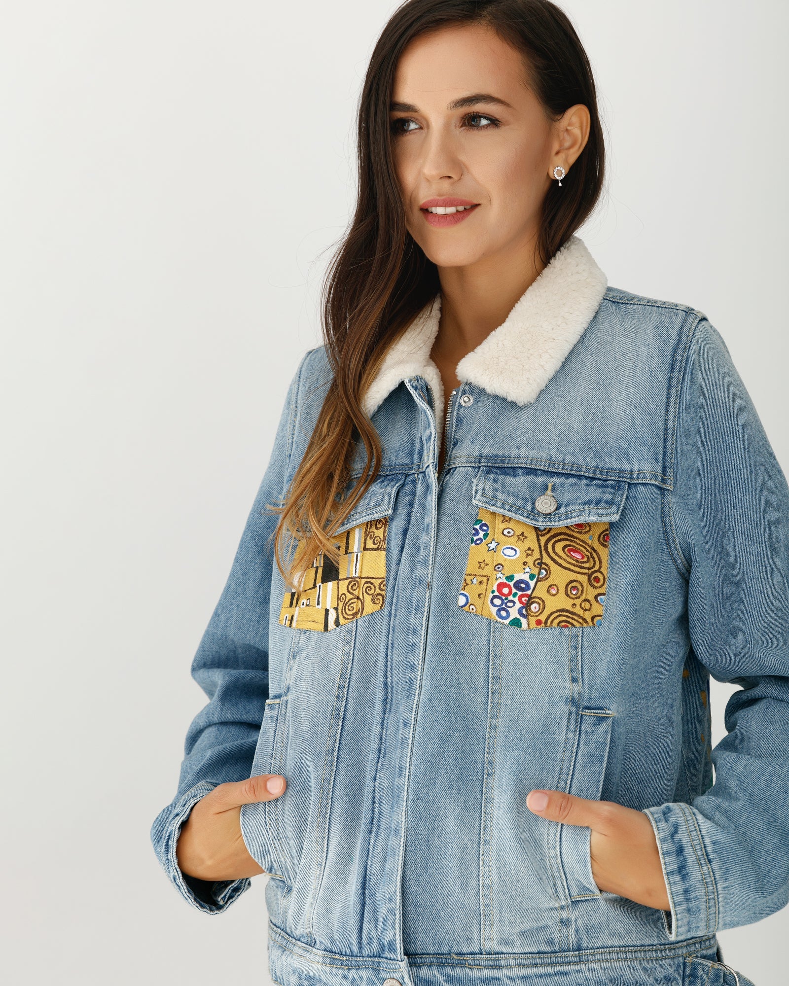 Denim Jacket The Kiss - Gustav Klimt light blue fur, perfect for colder days. It can be the piece of resistance of your outfits; a key item that makes any outfit pop.