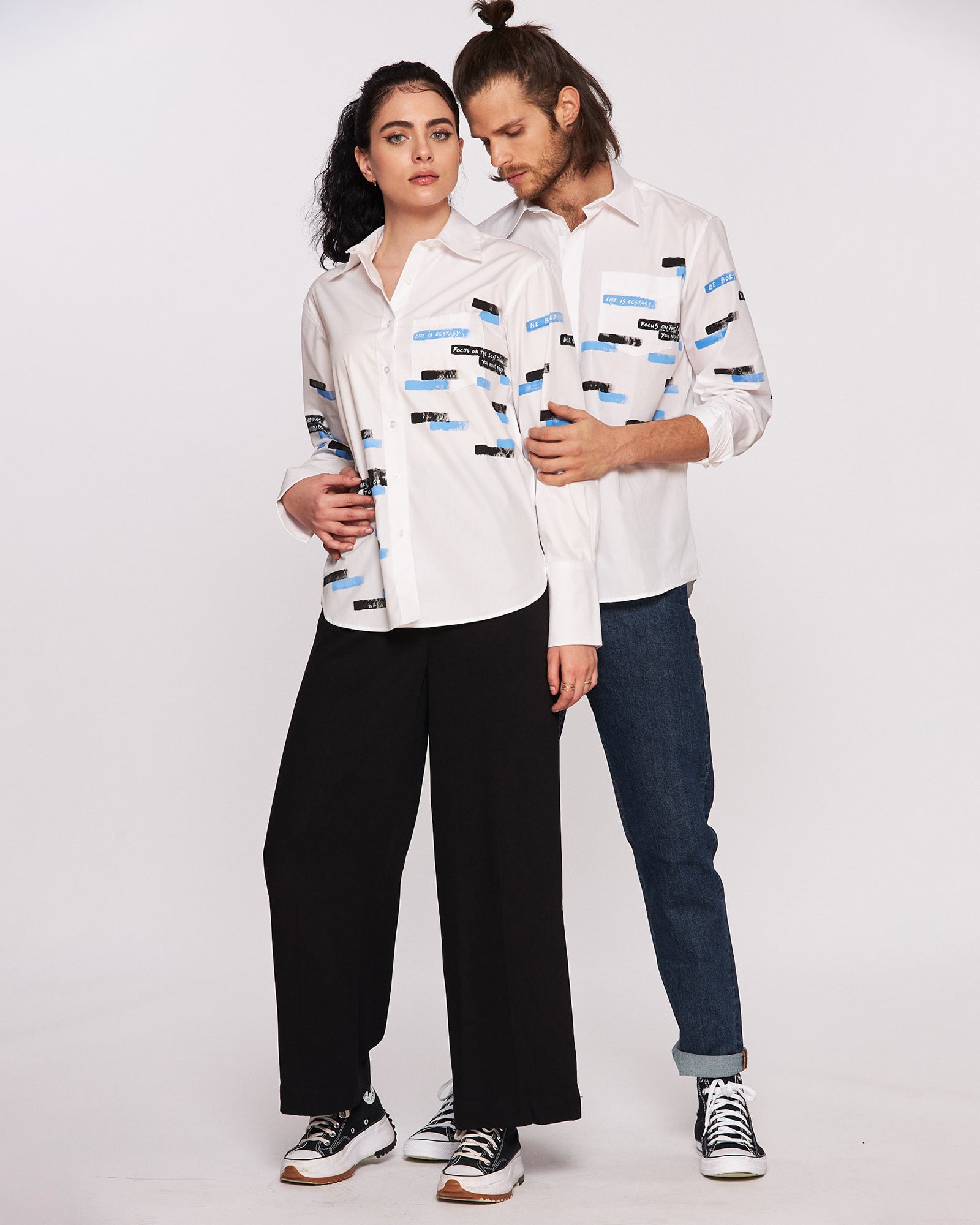 With an expressive print but keeping a relaxed, casual and objective line, the shirt hand-painted in contrasting colors will make your outfit make an impact no matter the event. This garment offers a casual air and the combination of messages and neutral colors means that it can be integrated even into casual-elegant outfits.