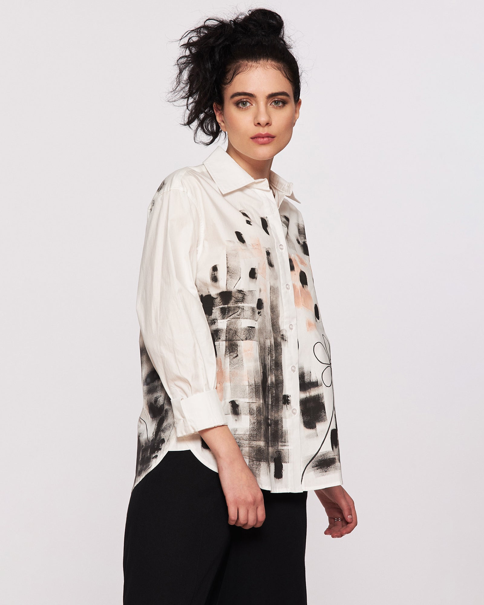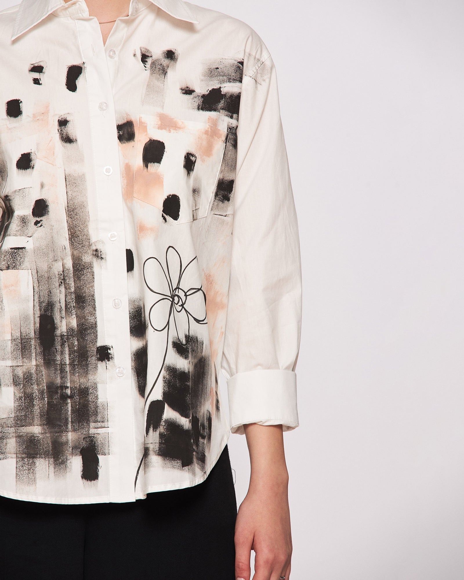 "The touch of nature" is a white oversized shirt inspired from men's style, featuring still a feminine air through the curvature lower of the product but also through the relaxed print, with slightly romantic shades in neutral colors and yet