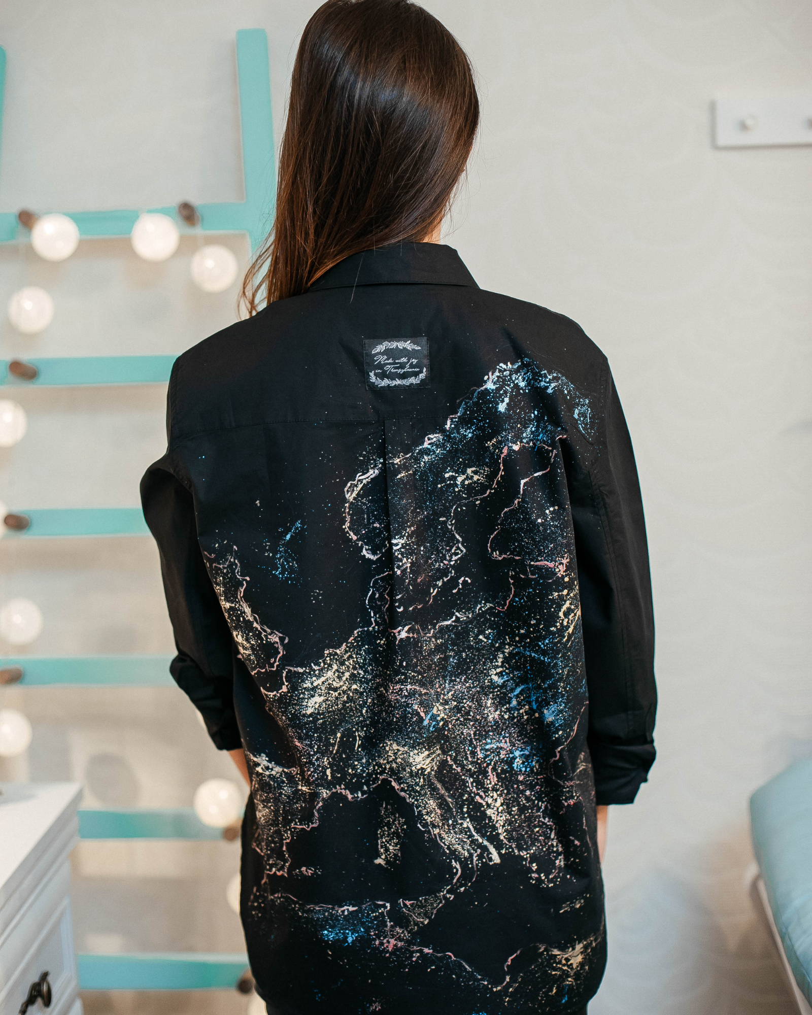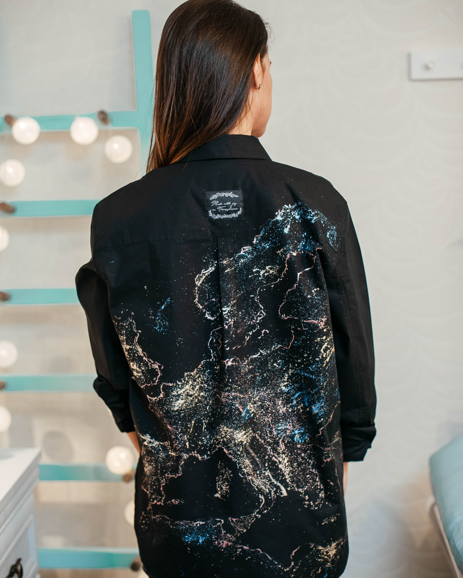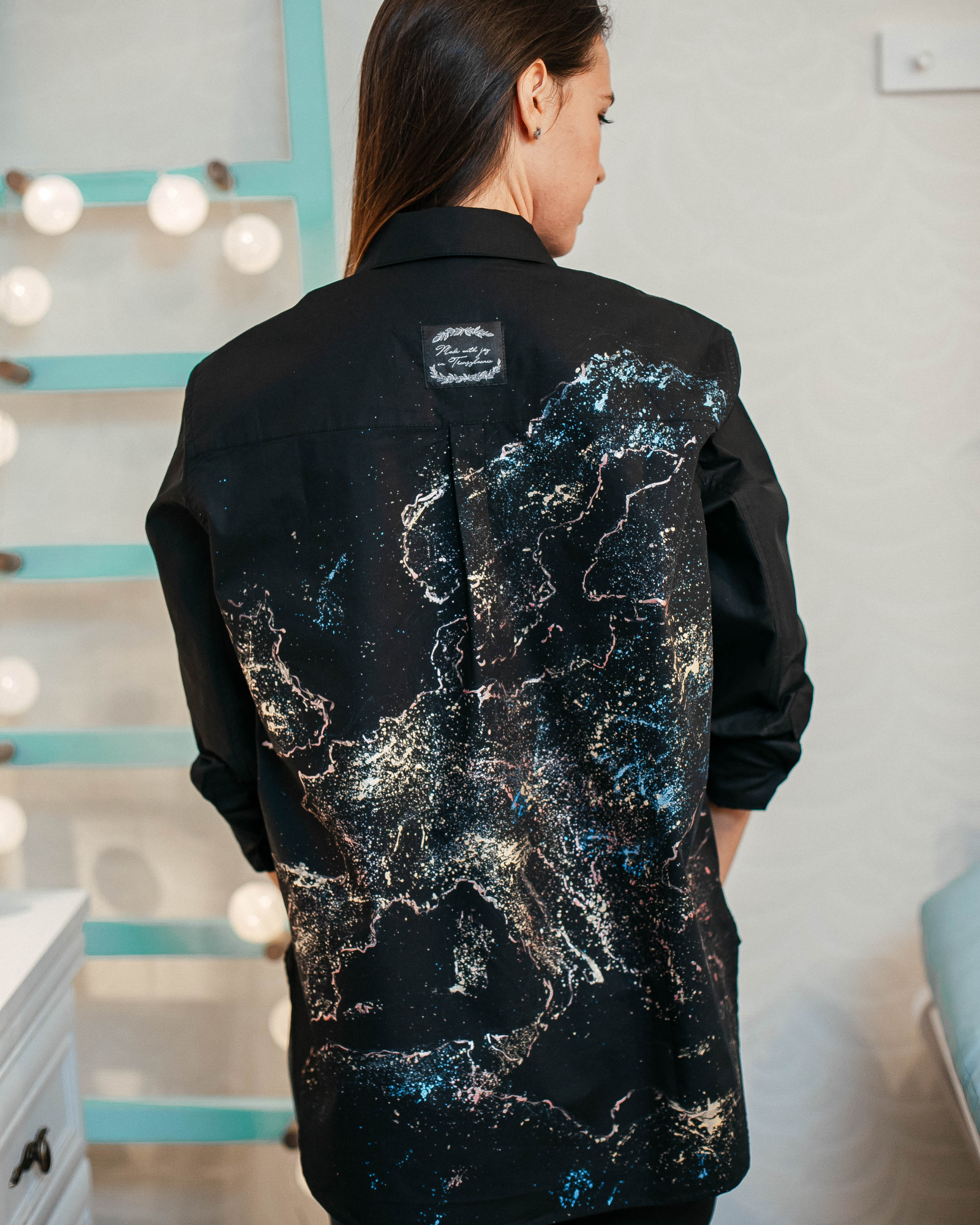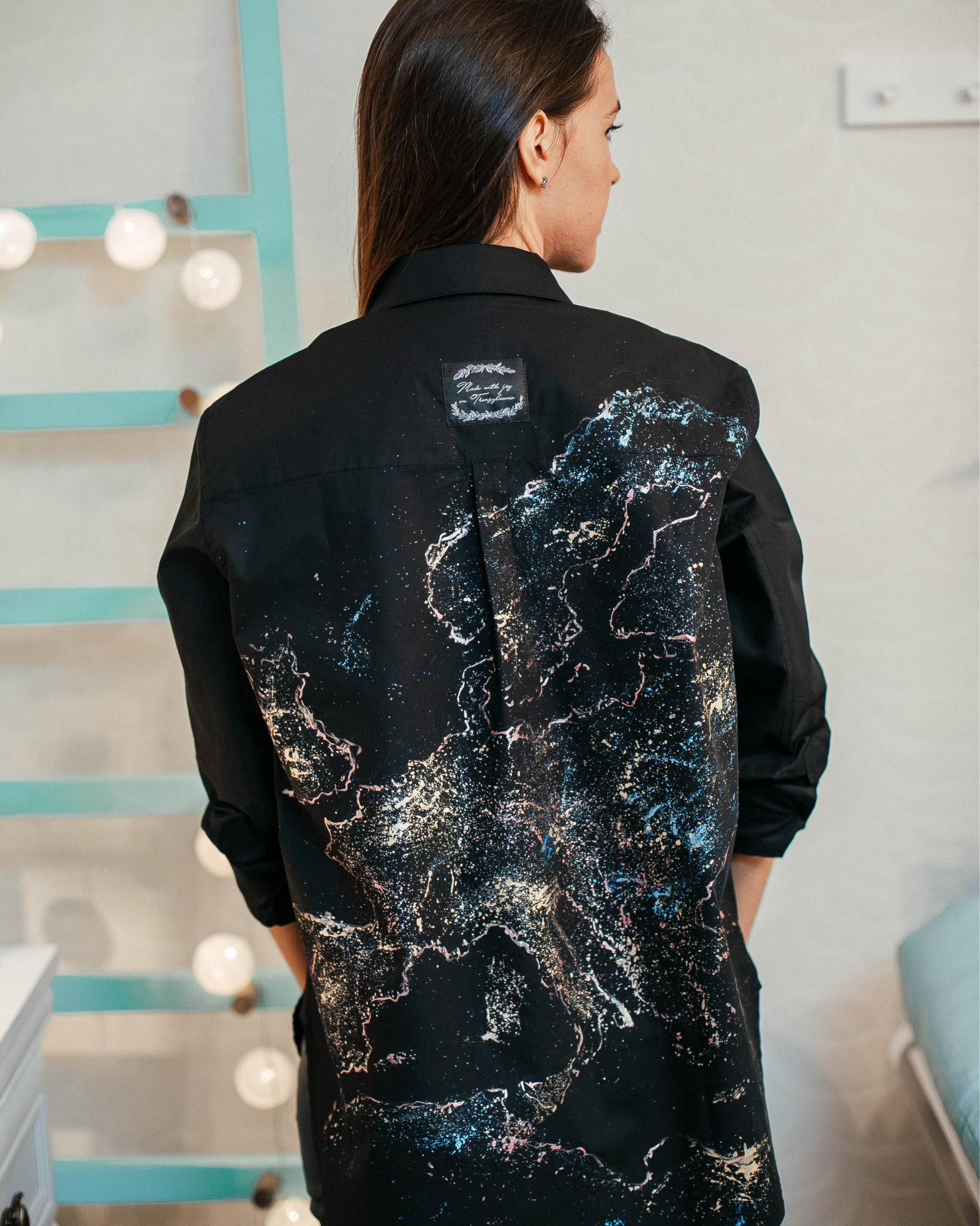 Această cămașă neagră din bumbac are un croi masculin, care adaugă o notă modernă și lejeră în garderoba ta. Cămașa impresionează printr-un detaliu unic: un model care ilustrează o noapte sublimă, cu lumini strălucitoare care evocă orașele lumii. Această reprezentare adaugă o notă de mister și rafinament, oferindu-ți posibilitatea de a purta o operă de artă. Poate fi îmbrăcată într-o varietate de contexte, de la întâlniri de seară la evenimente mai formale sau chiar și într-o zi obișnuită pentru a-ți evidenția stilul aparte. Cu croiul său oversized, te vei simți confortabilă și, în același timp, foarte stilată. Este o alegere excelentă pentru cele care doresc să iasă în evidență și să aducă o notă de originalitate în ținutele lor.