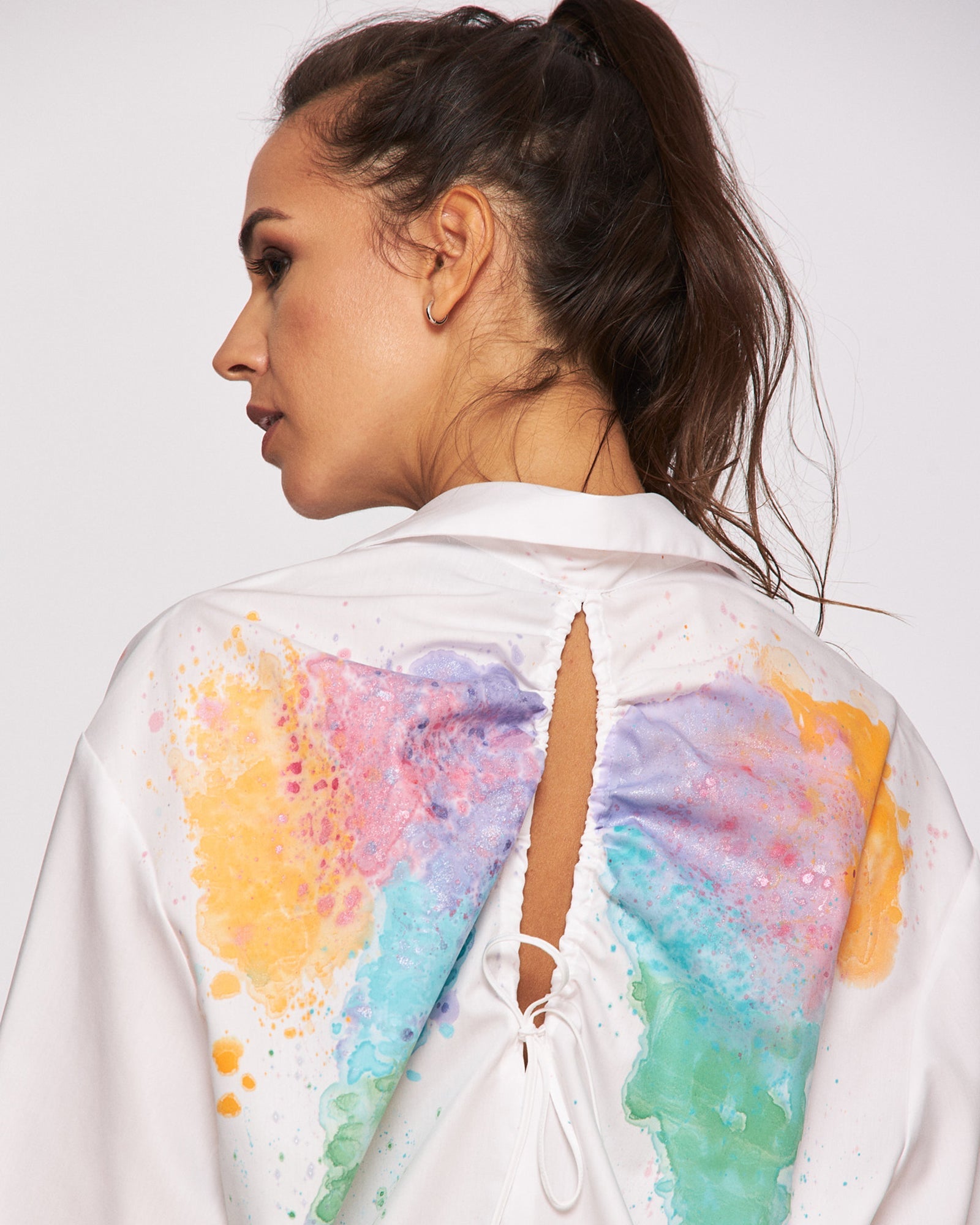 Let's start each day inspired! And what can be more appropriate than a tailored outfit? Create the most stylish combinations with this oversized shirt, a trend of the moment, and brighten your day with these warm colors artistically used in the hand painting of the shirt.
