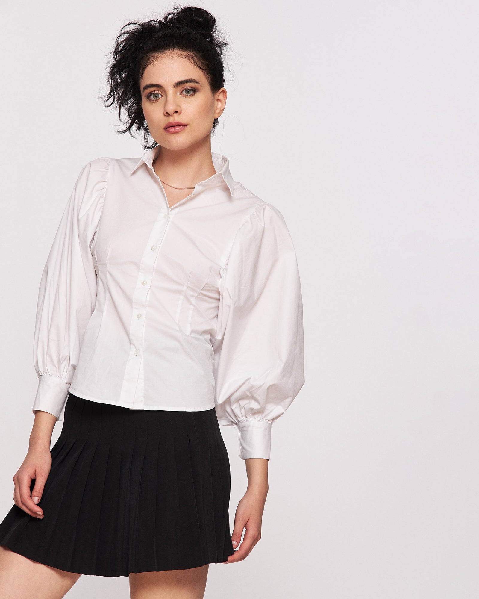 The white shirt is the most important and versatile piece of clothing in any woman's wardrobe. And this slightly cambered model with puffy sleeves that fits perfectly with the current trends highlights every woman's waist and gives an elegant and sophisticated touch to the outfit.