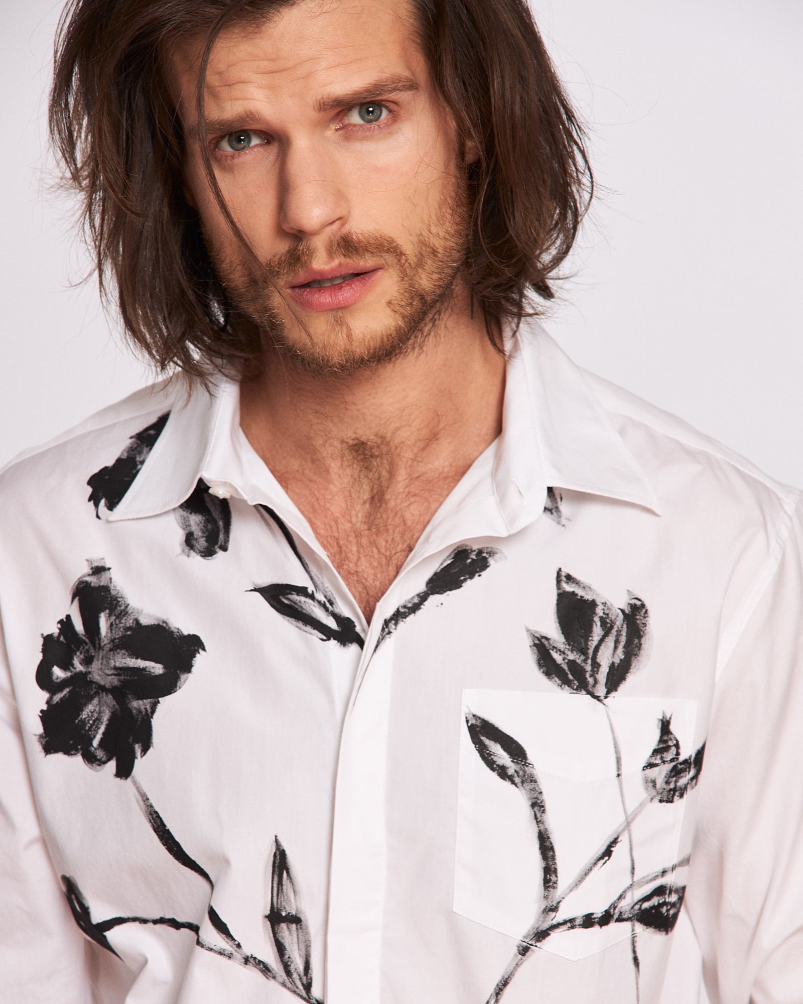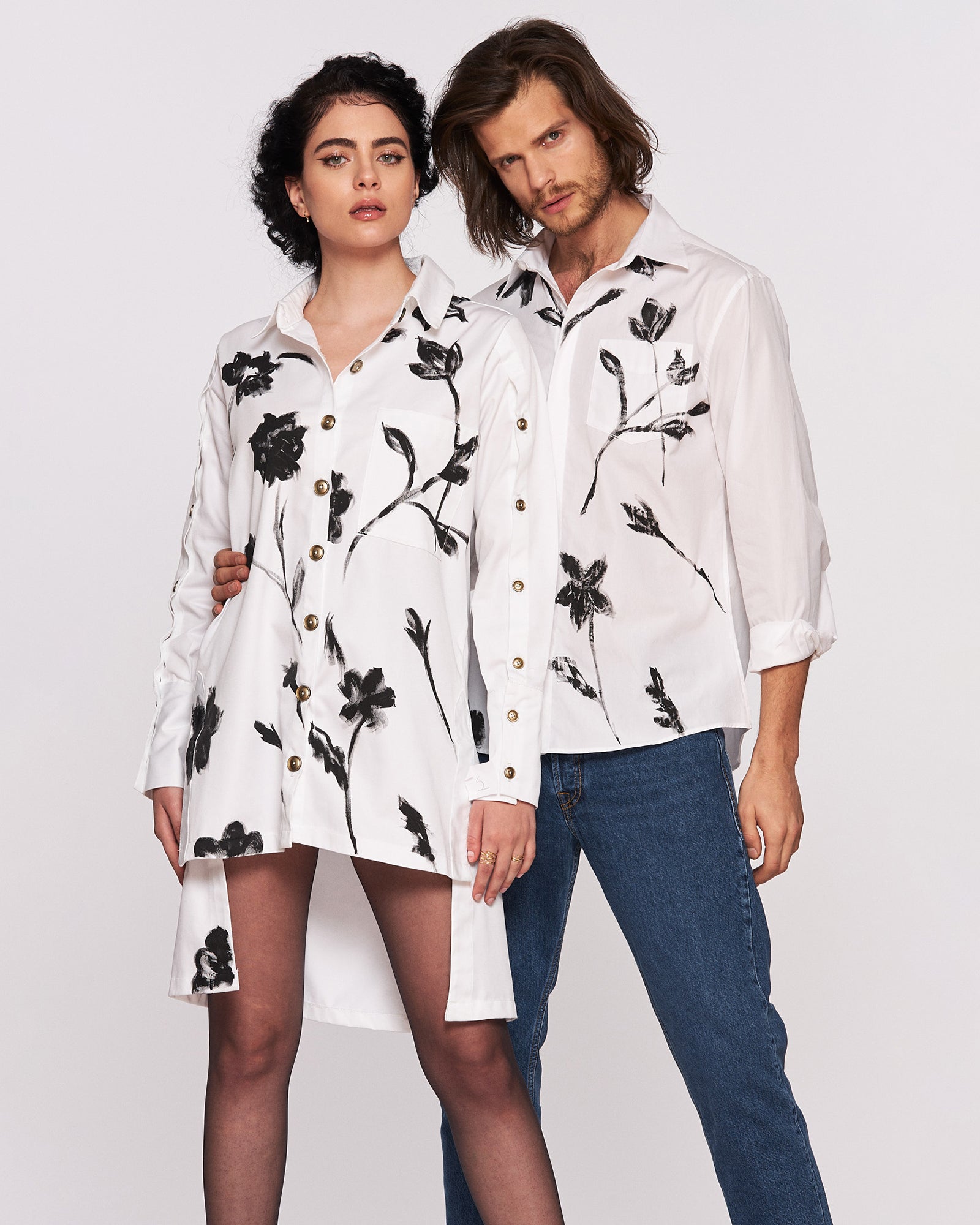 Modernize your wardrobe with this hand-painted "Monochrome Flowers" shirt for a modern and on-trend look and you'll be sure to turn heads. Wear this shirt with attitude and personality and let it speak for itself about your unique style.