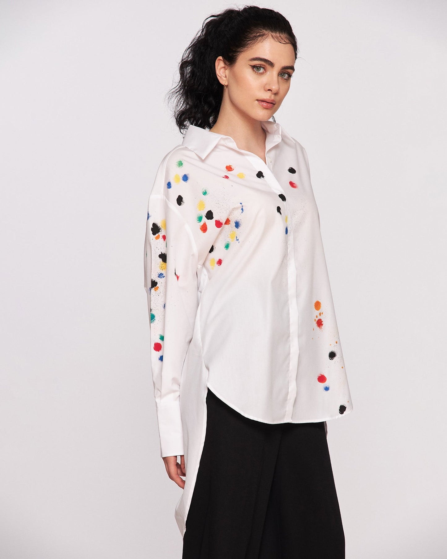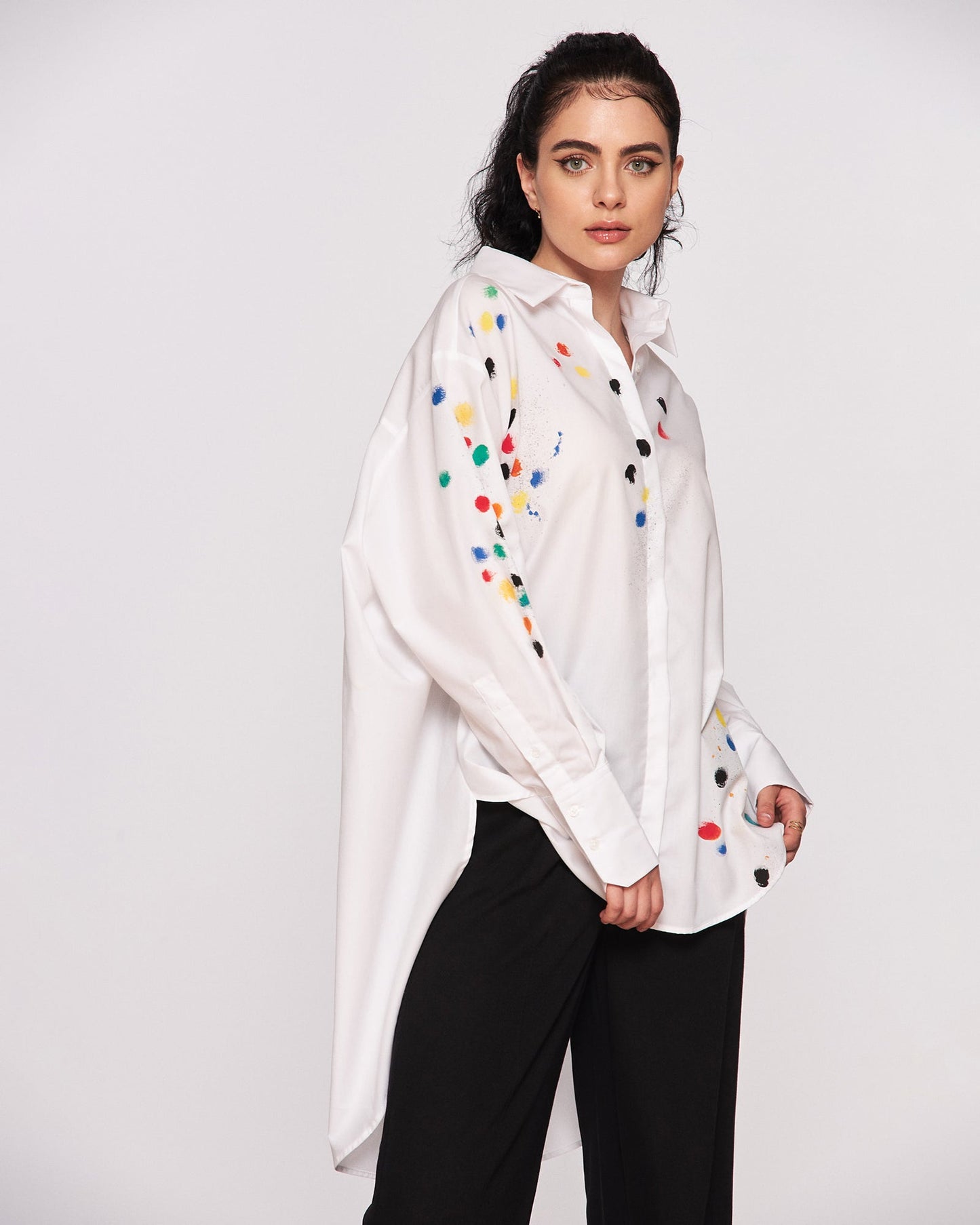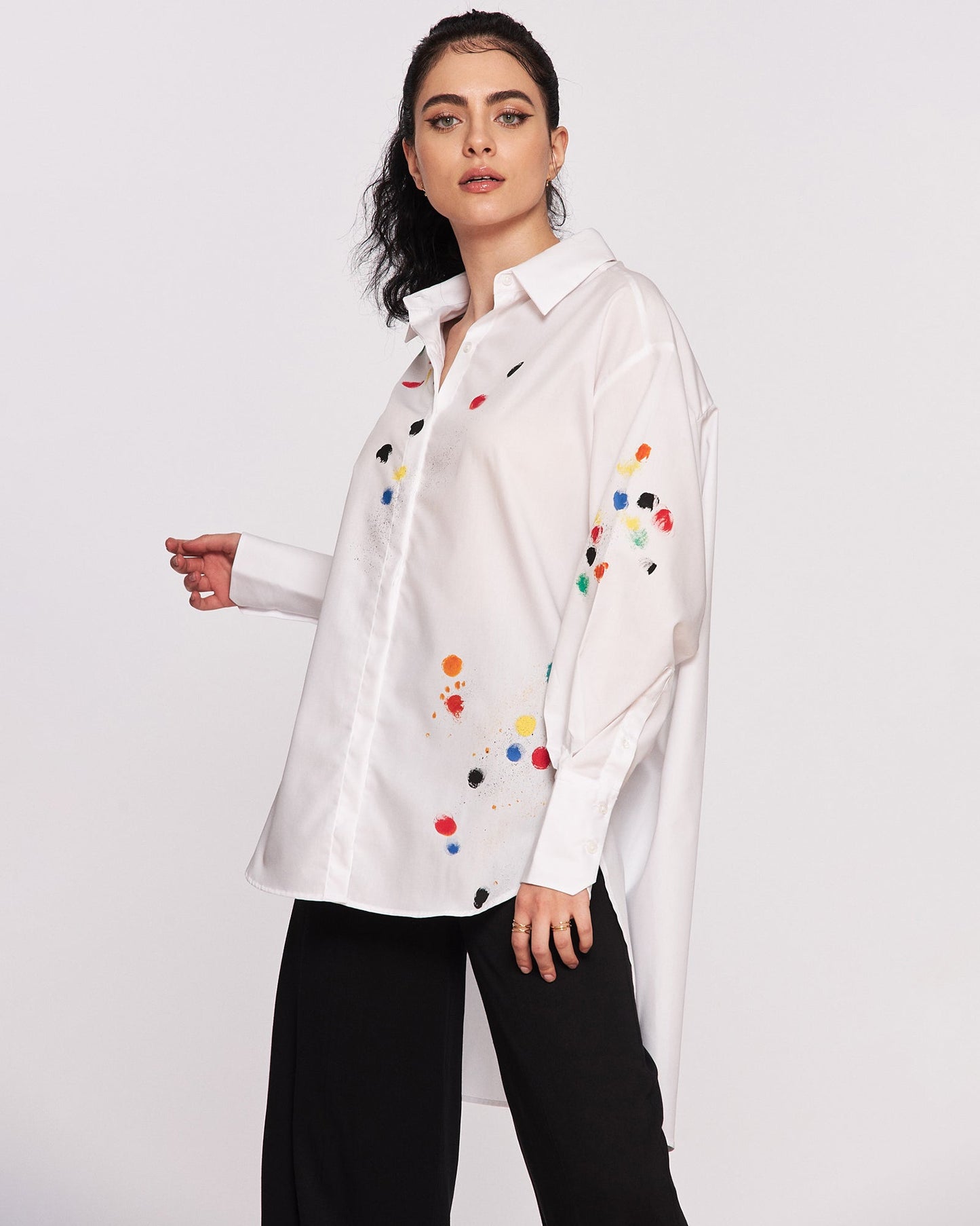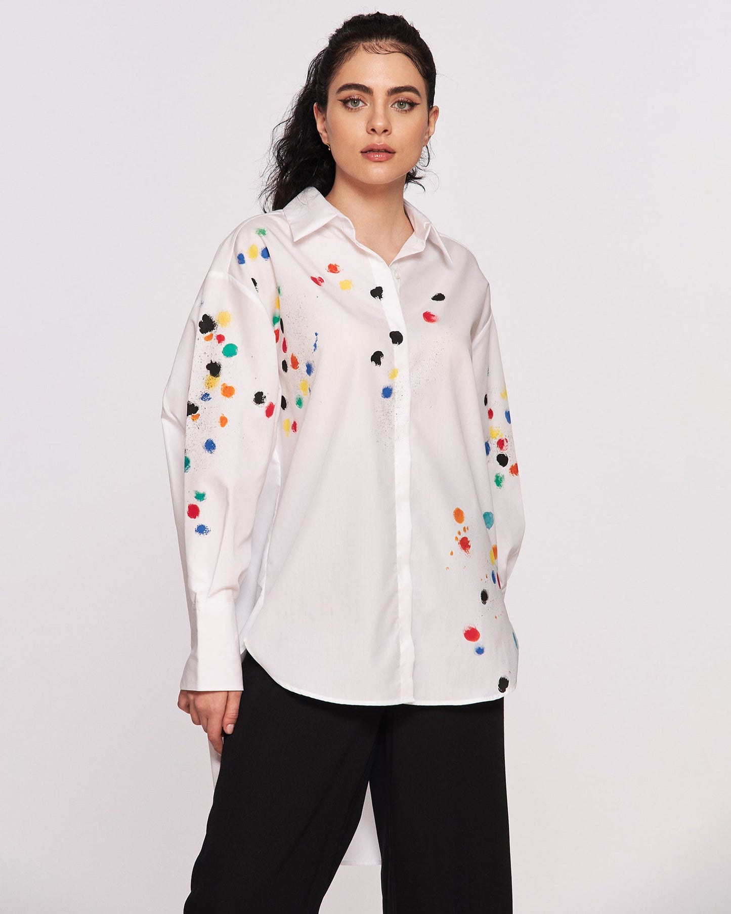 Joy and color! Comfortable and cool cotton shirt for women. Color painting pattern gives a cheerful, feminine look to this unique garment. Surely this shirt model will be the main attraction of the outfit worn.