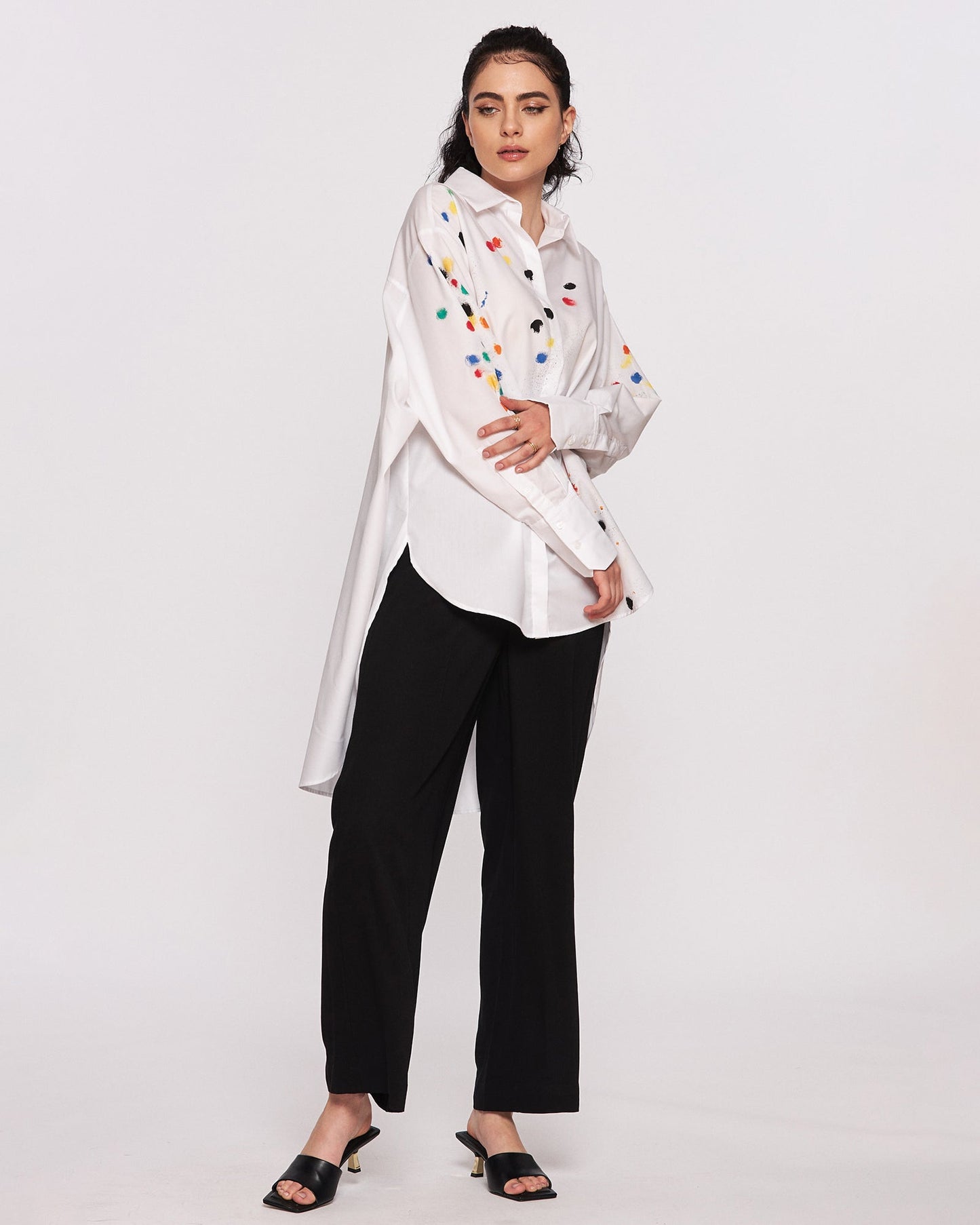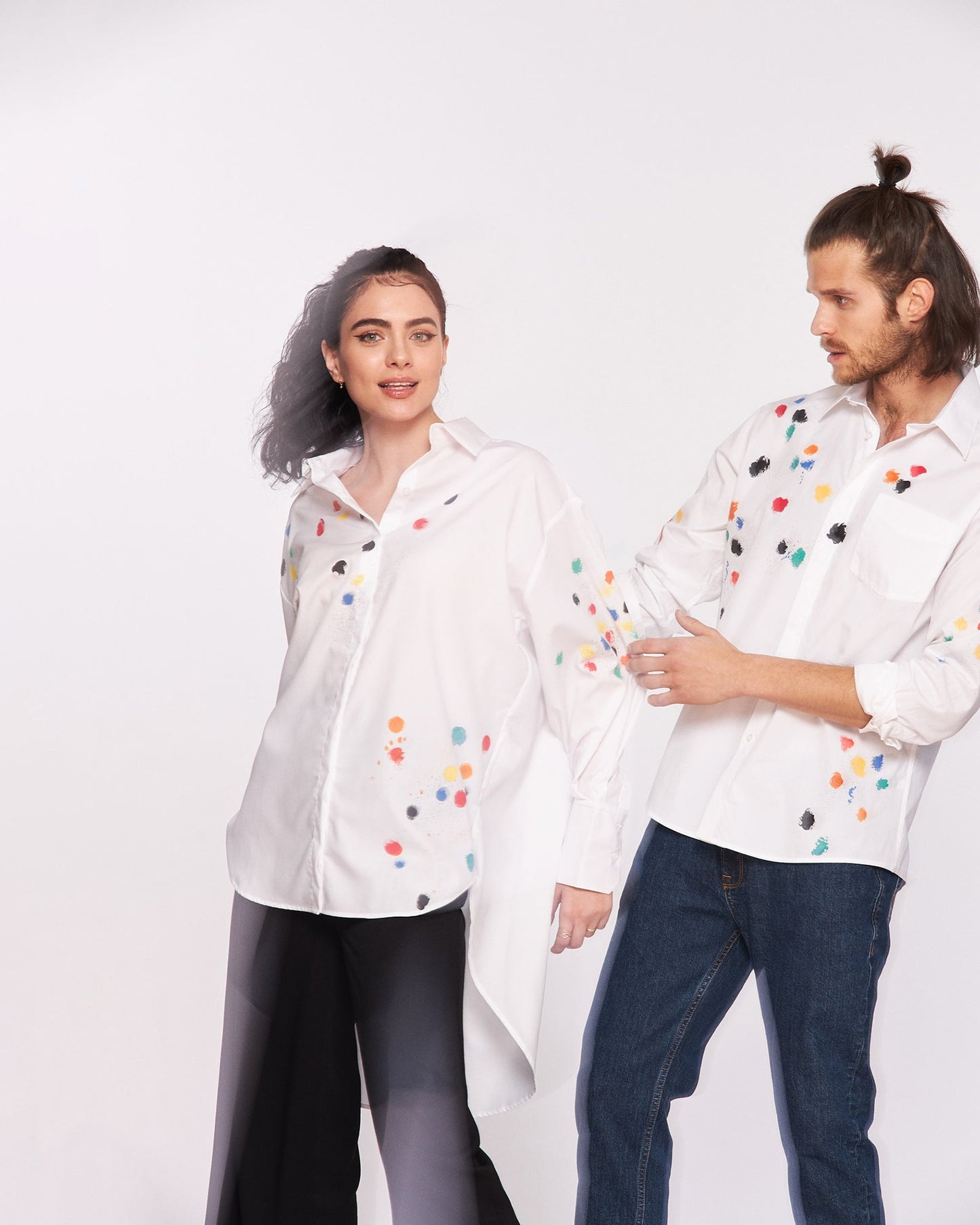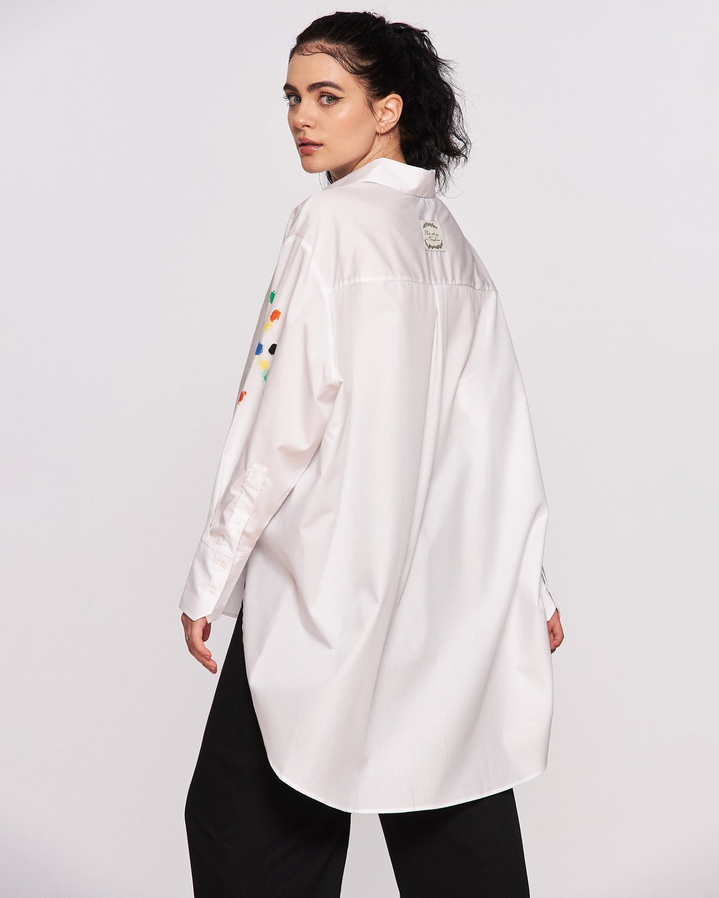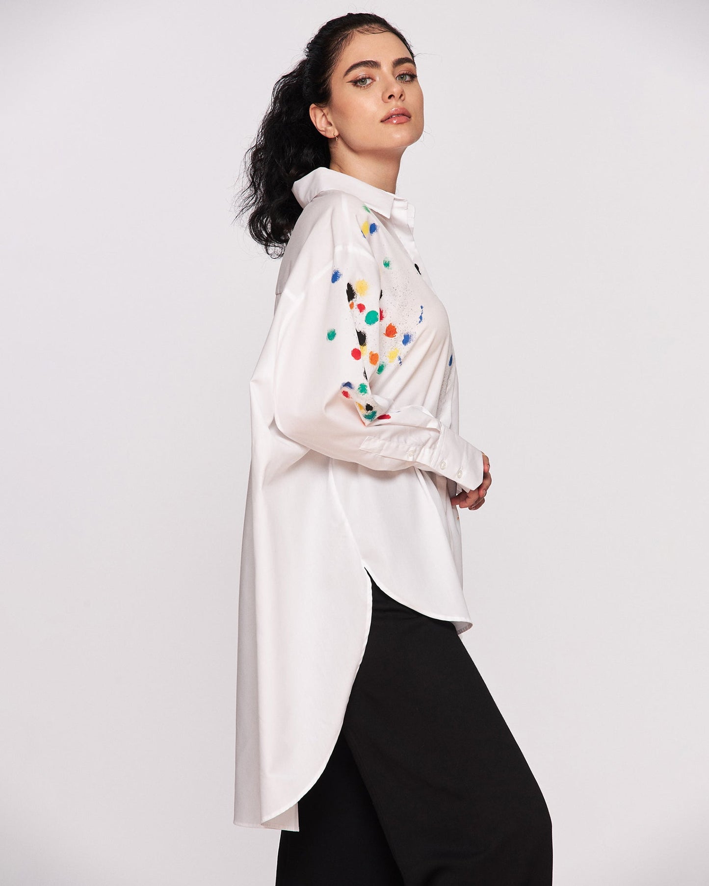 Joy and color! Comfortable and cool cotton shirt for women. Color painting pattern gives a cheerful, feminine look to this unique garment. Surely this shirt model will be the main attraction of the outfit worn.