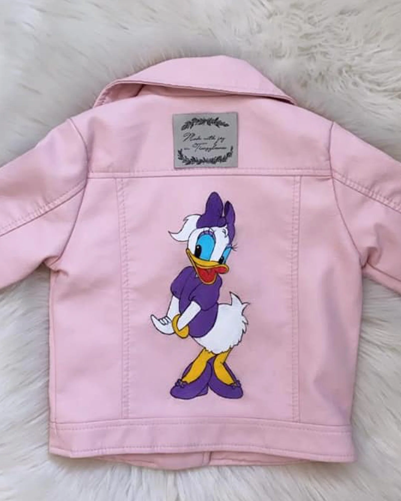 Girls pink leather jacket hand-painted with beloved cartoon character