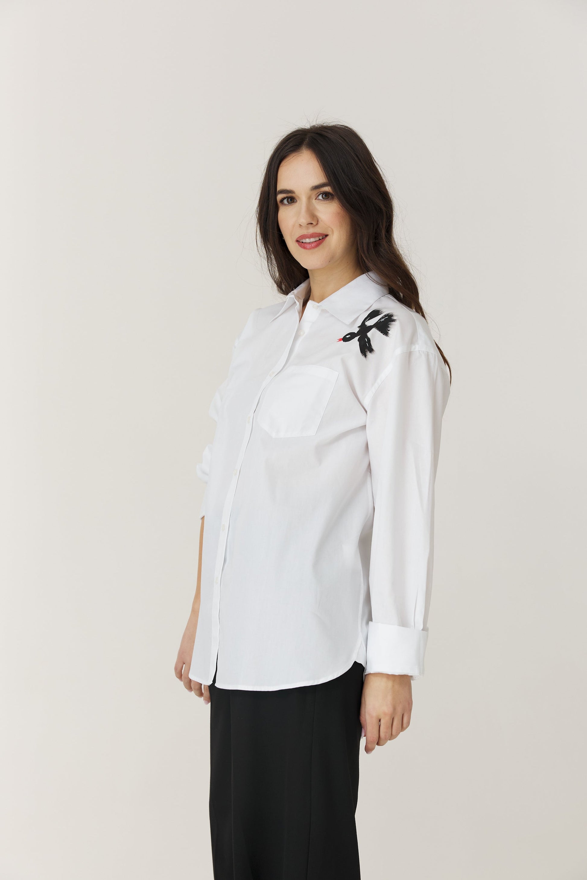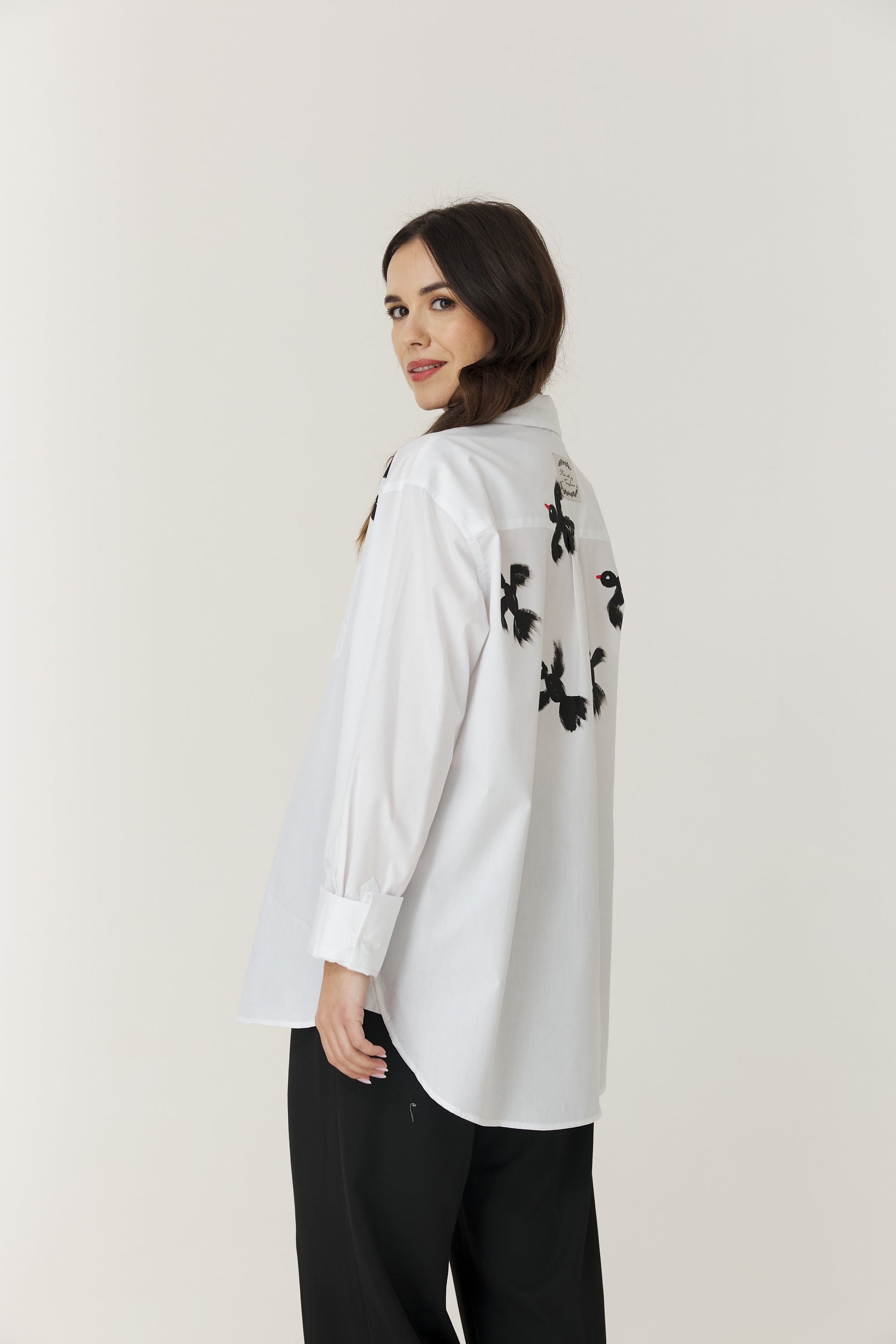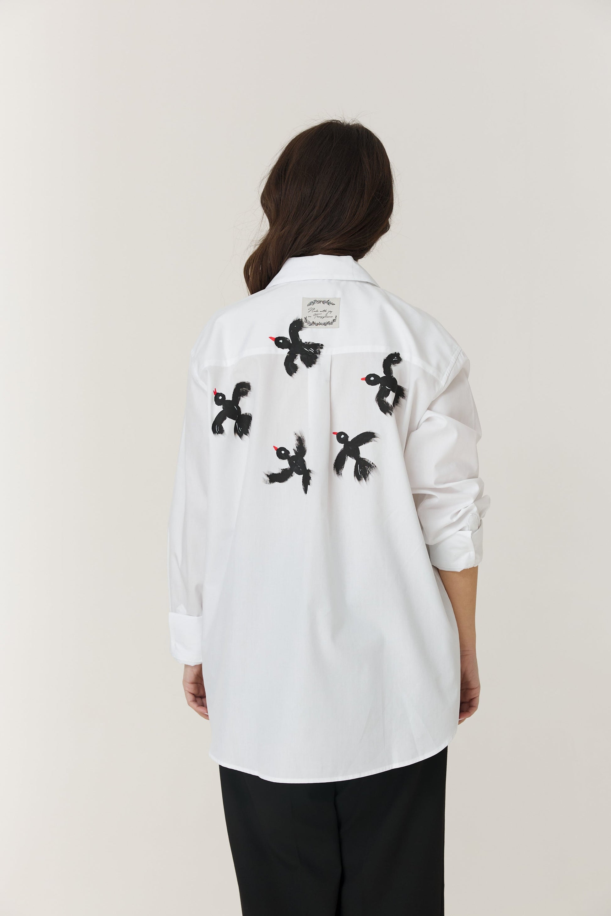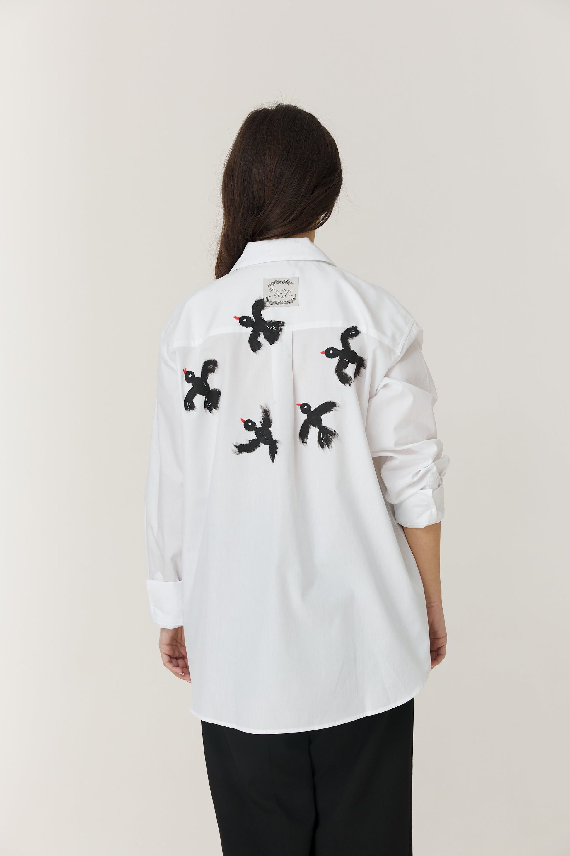 Indulge in the allure of the night with our Nocturnal Aviary Blouse, featuring striking black birds against a backdrop of crisp white fabric. This enchanting piece captures the mystery and elegance of nocturnal creatures in flight, adding a touch of intrigue to your wardrobe. Whether paired with tailored trousers for a polished look or with denim for a more relaxed vibe, this blouse is sure to make a statement with its captivating design.