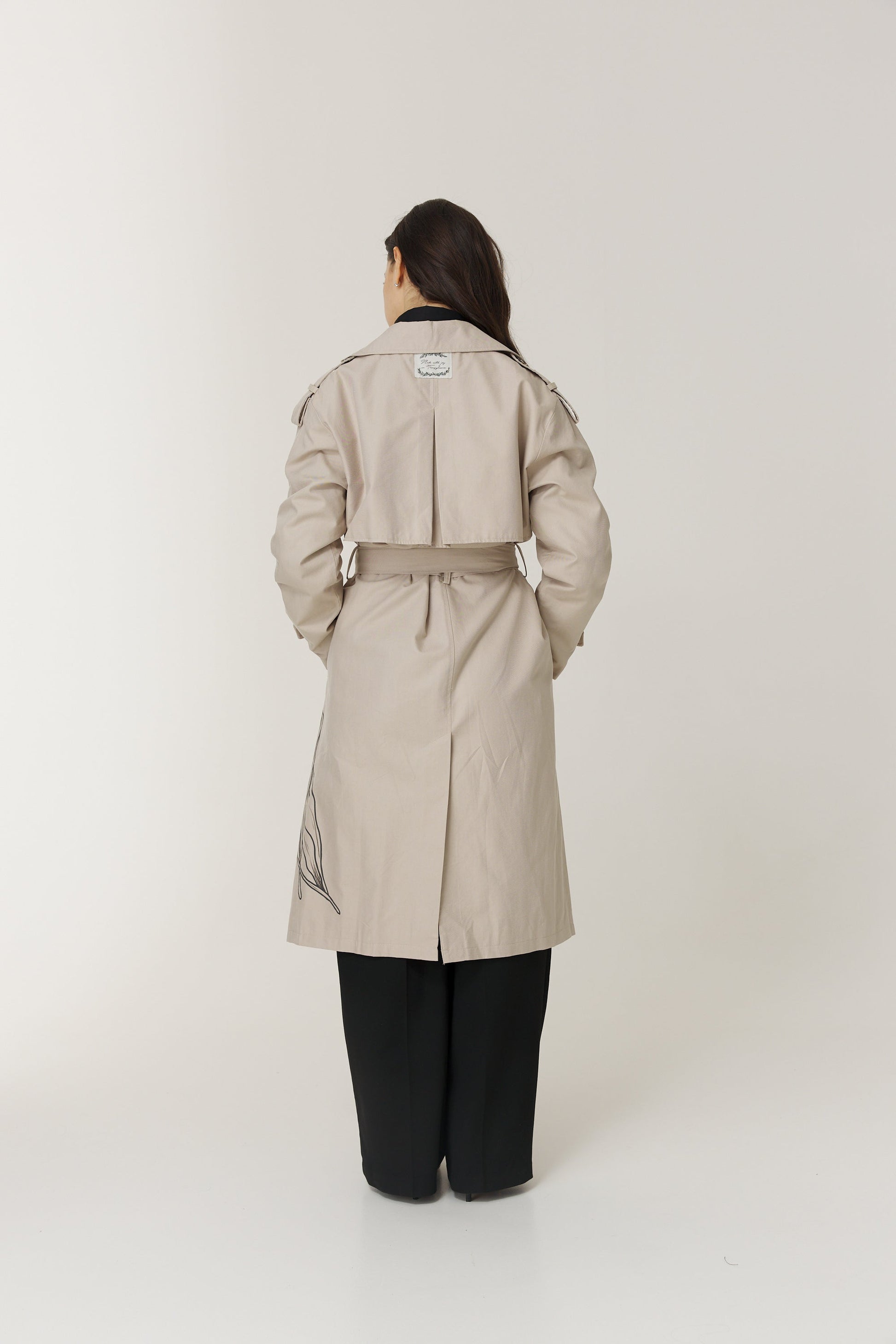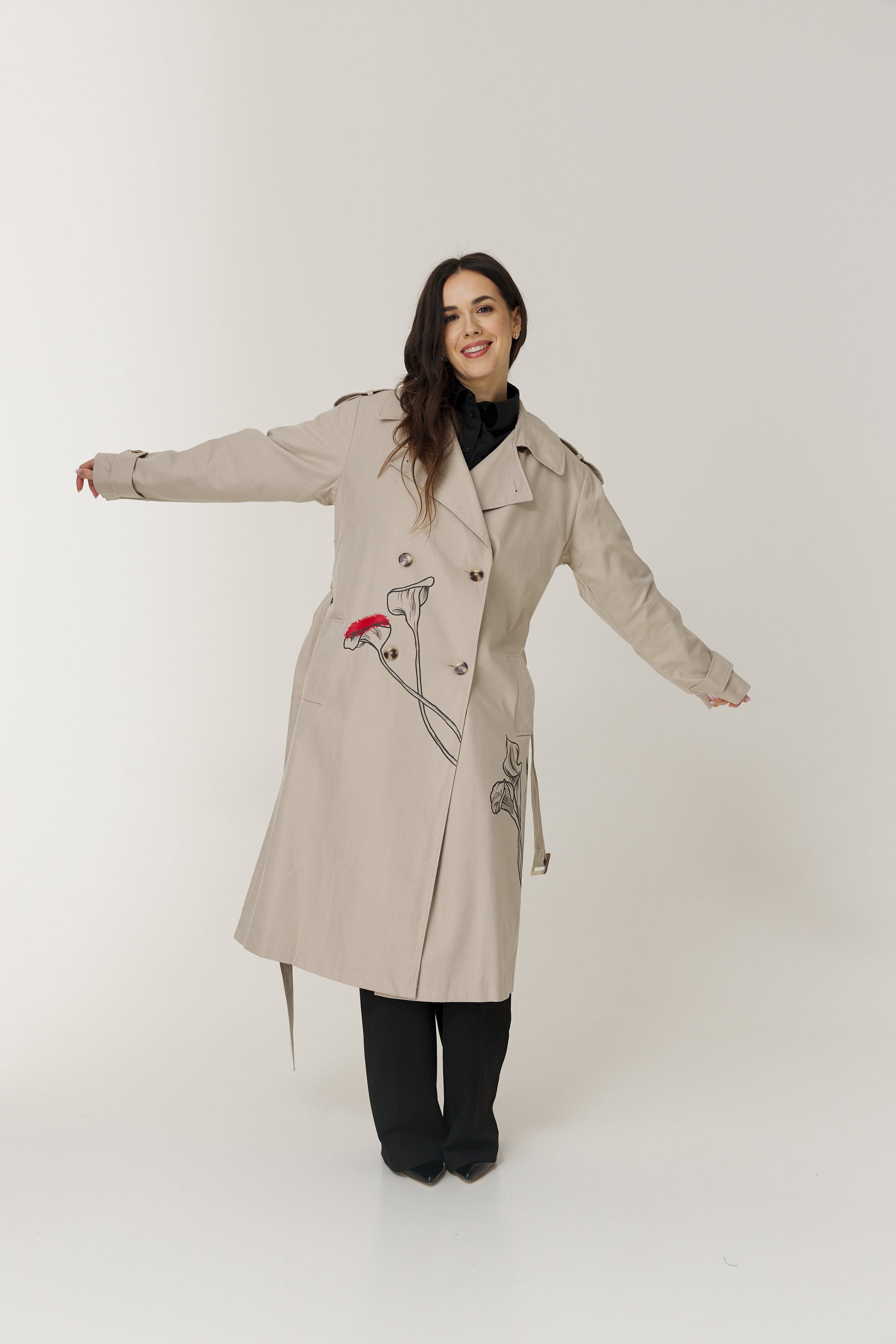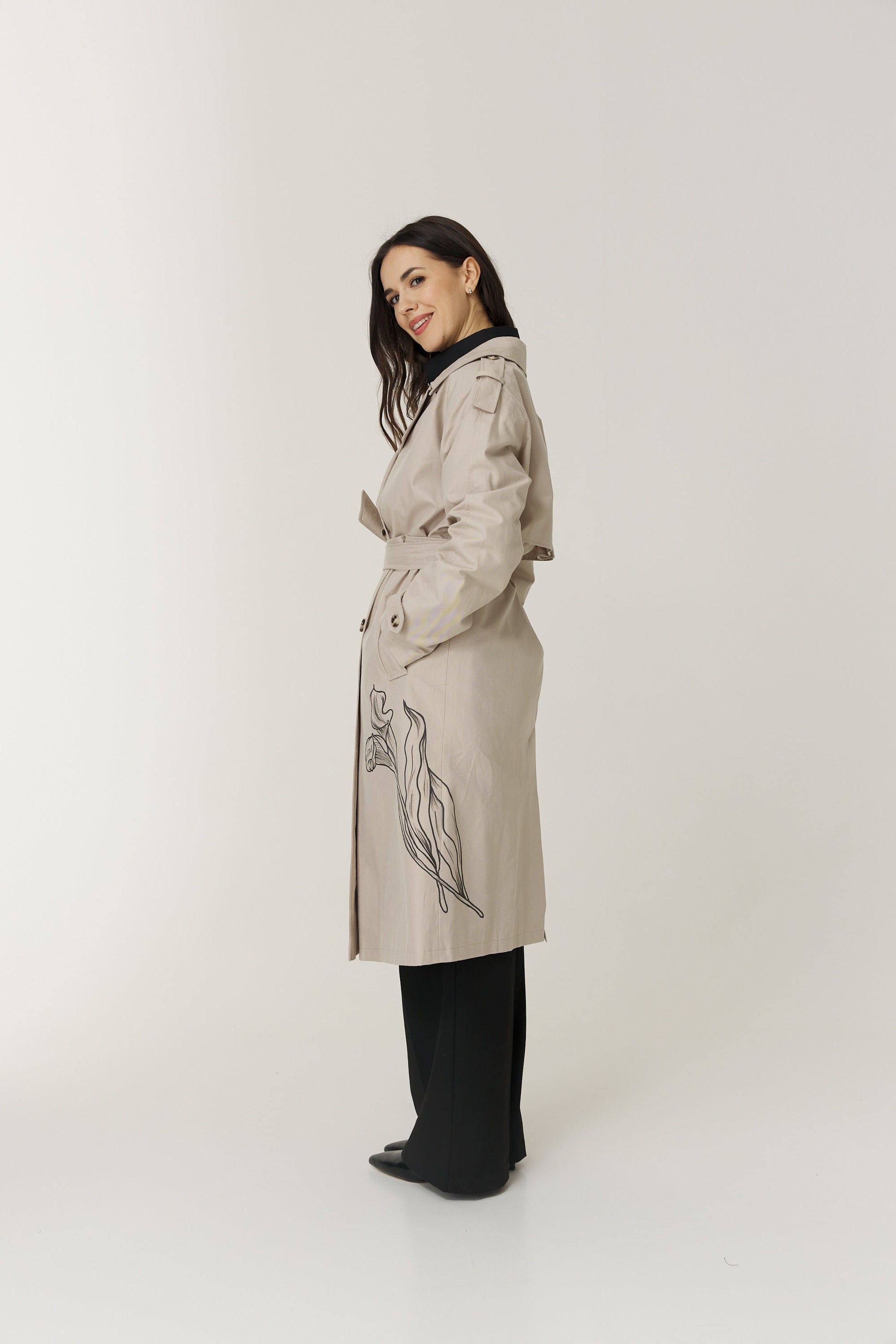This elegant trench coat is adorned with delicate floral motifs inspired by the beauty of Calla lilies. Its classic cut and subtle details exude sophistication, while the floral print adds a touch of femininity and freshness. It's the perfect choice to bring a spring-like and elegant vibe to your wardrobe.
