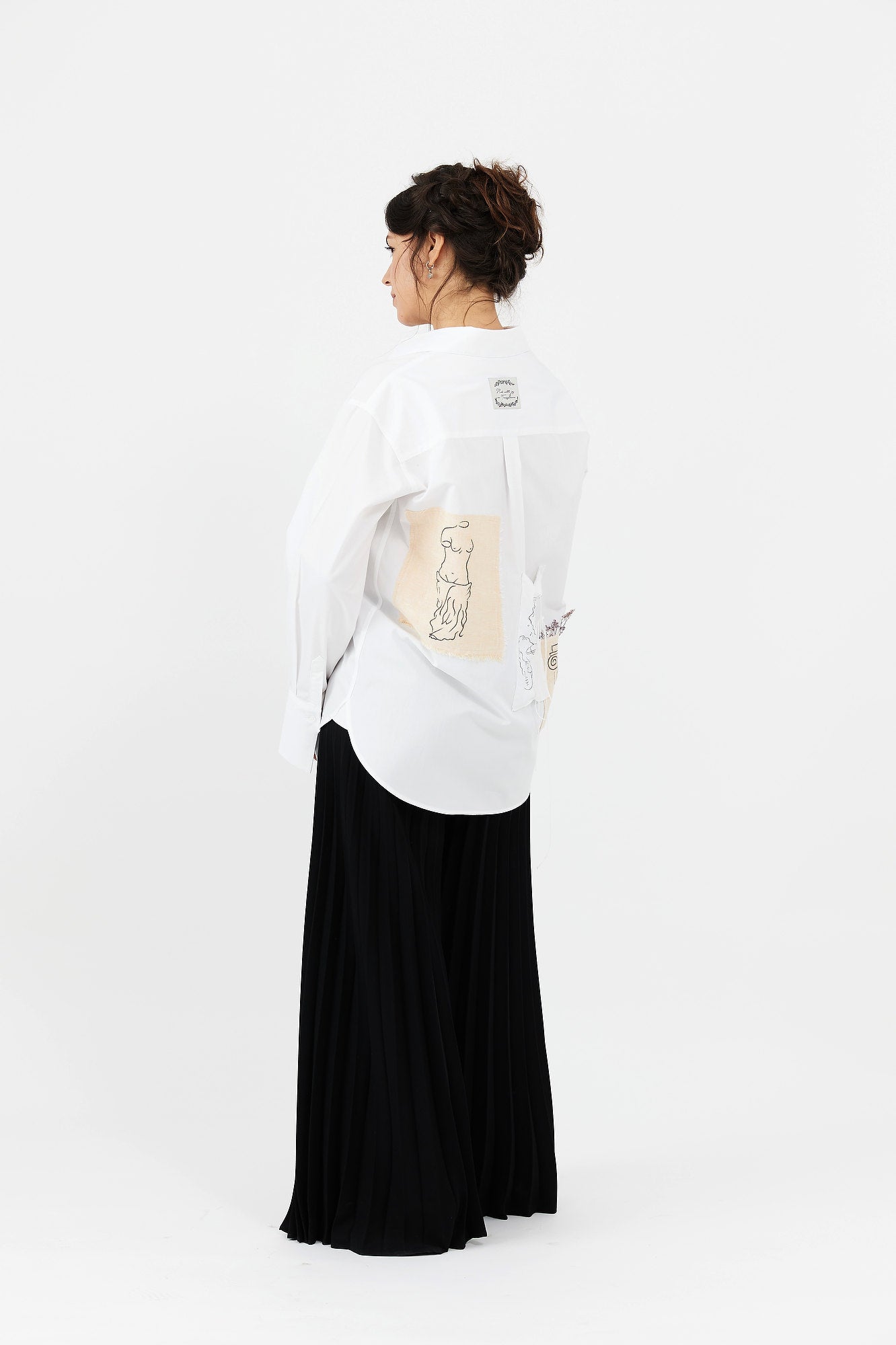 Cămașa "Artefact artist" este accesorizata cu patch-uri pictate manual cusute.