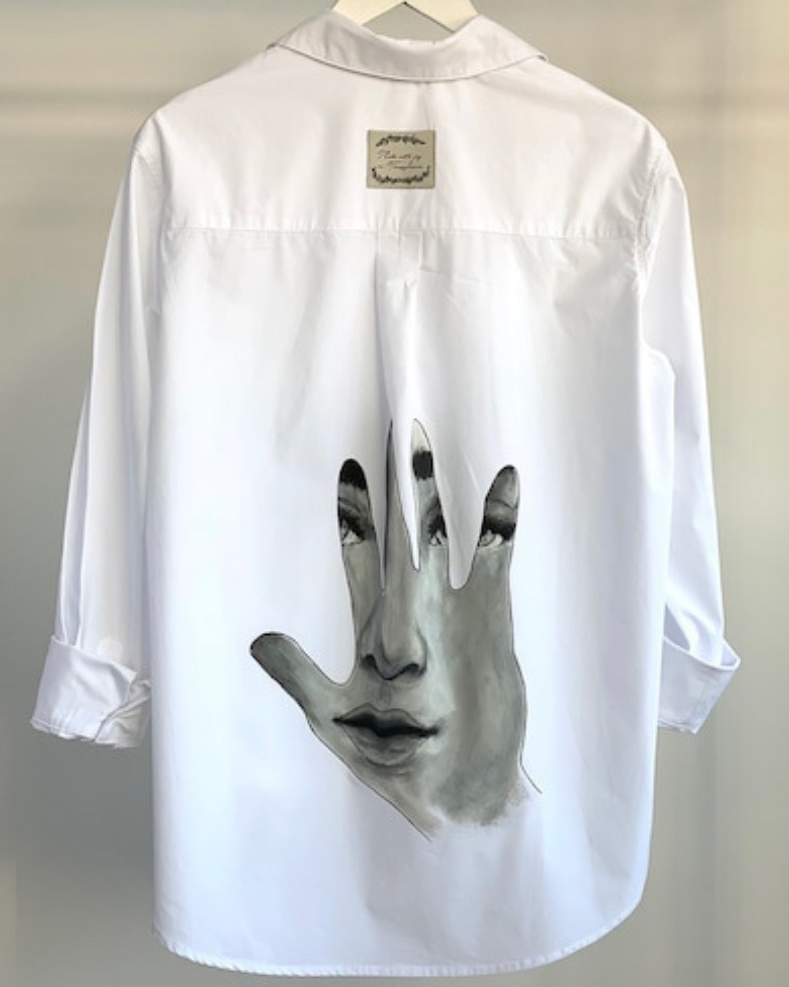 Această cămașă prezintă un design unic, cu o palmă stilizată pe care se distinge clar conturul unei fețe. Detaliile sunt intricate și atent realizate, permițând observatorului să distingă expresia și trăsăturile feței în palma desenată. Această imagine surprinzătoare adaugă o notă de mister și fascinație întregului design al cămășii. Este o piesă vestimentară care stârnește curiozitatea și oferă un aspect distinctiv și original, potrivită pentru cei care apreciază creativitatea și individualitatea în modă.