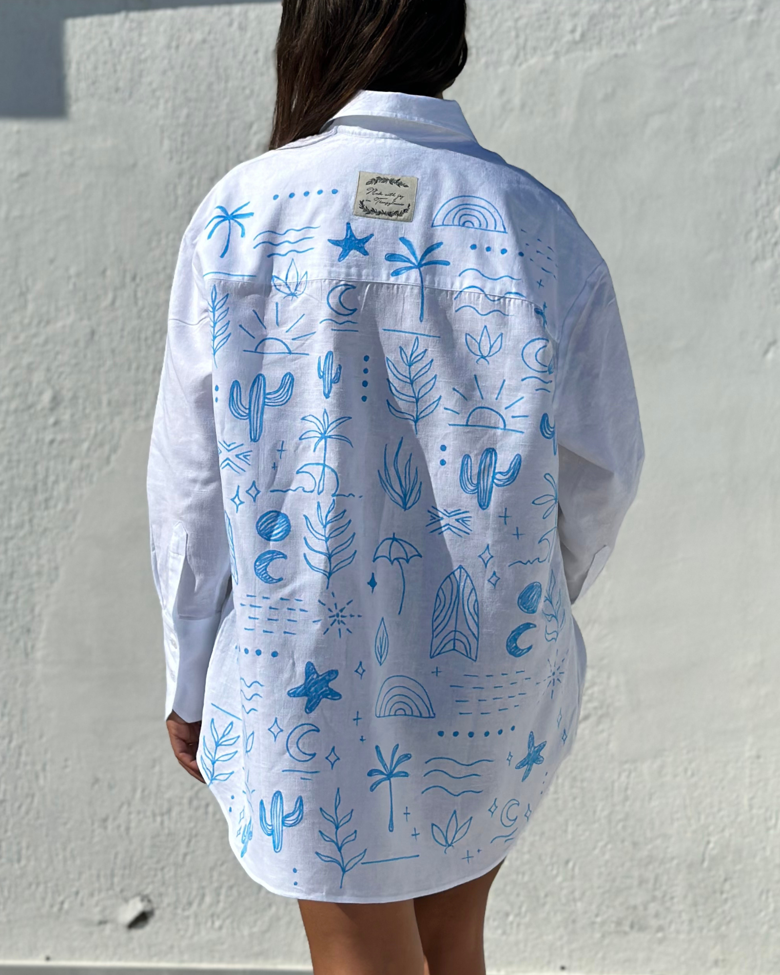 Această cămașă din in este o explozie de bucurie și energie a verii, redată în nuanțe vibrante de albastru. Cactușii, palmierii, valurile și soarele sunt prezenți în acest design ca simboluri ale verii. Cactușii aduc un strop de exotism și originalitate, palmierii evocă senzația de relaxare sub umbra lor, valurile sugerează răcoarea și veselia de pe plajă, iar soarele strălucește cu o energie pozitivă. Cu nuanțele de albastru utilizate în mod atent, această cămașă transmite o senzație de prospețime și calm, specifică verii. Este alegerea ideală pentru a-ți exprima iubirea pentru acest sezon plin de viață și aventură.