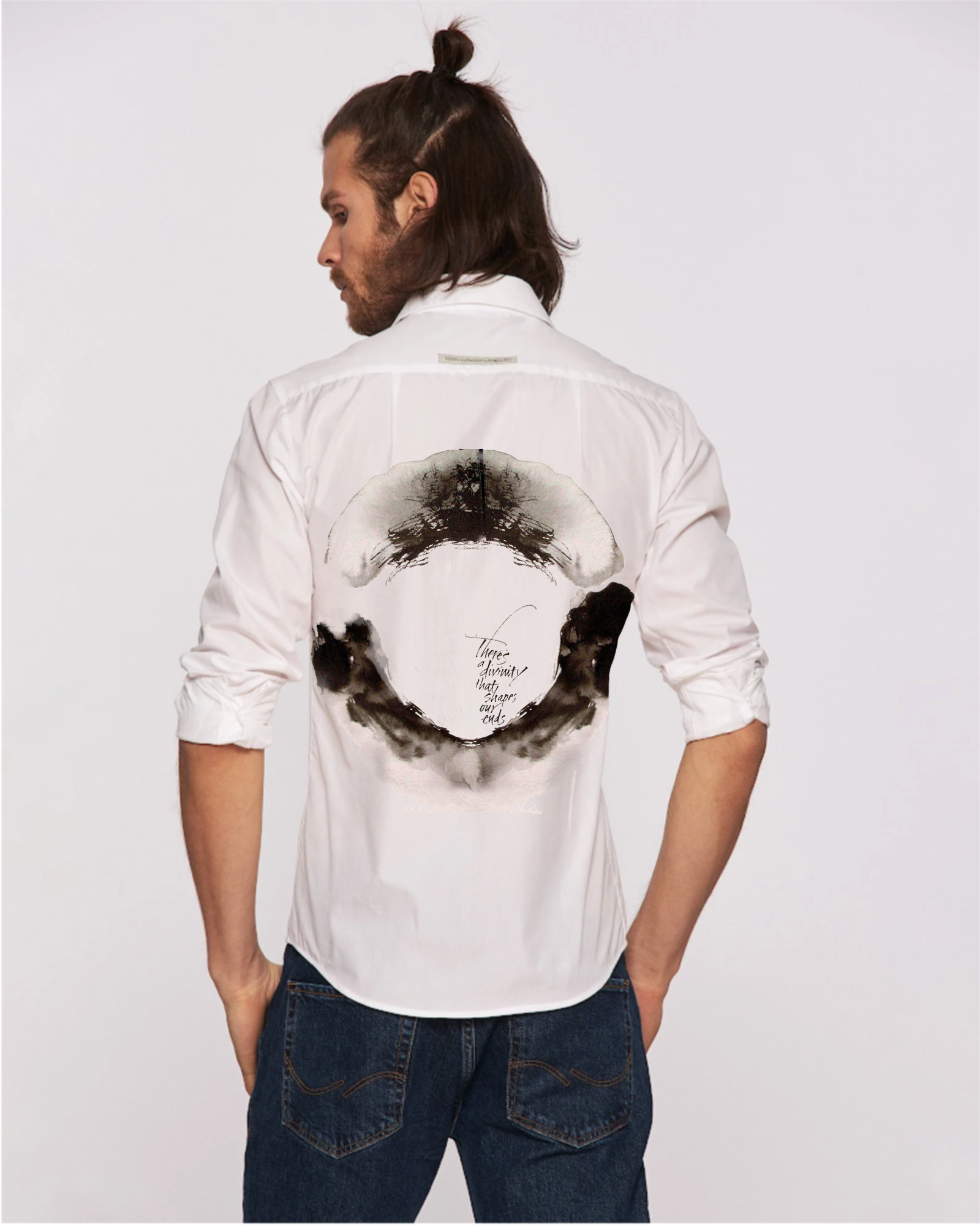 Cămașa pentru bărbați este decorată pe spate cu imaginea unui ochi, simbol al vigilenței și cunoașterii, asociat adesea cu divinitatea și înțelepciunea. Această pictură sugestivă adaugă o notă de mister și spiritualitate designului, oferind o interpretare subtilă și profundă. Detaliile sunt lucrate cu grijă pentru a conferi un aspect estetic plăcut și pentru a sublinia semnificația simbolică a elementelor prezente. Este o piesă vestimentară care nu numai că adaugă stil și eleganță, dar și exprimă o conexiune cu sfera divină și cu înțelepciunea ancestrală.