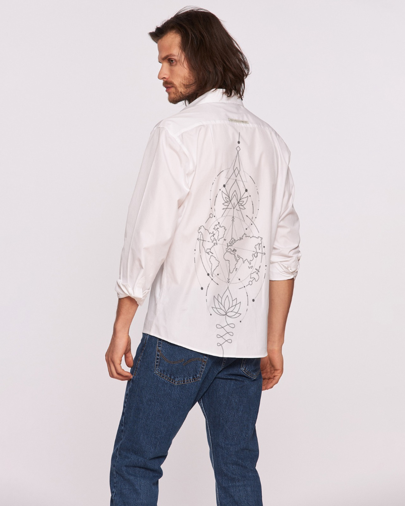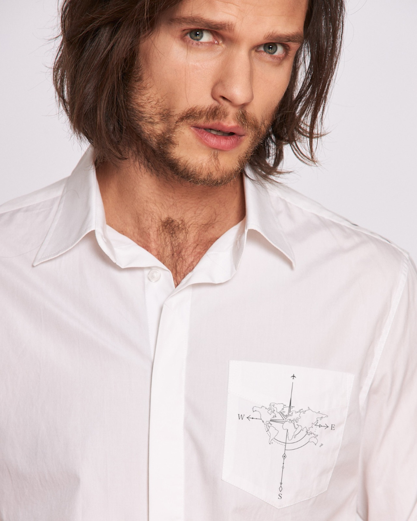 Această cămașă masculină, fabricată din bumbac de înaltă calitate, are un croi lejer pentru a oferi confort și libertate de mișcare pe tot parcursul zilei. Designul său simplu, dar elegant, este completat de un detaliu distinctiv, modelul de busolă plasat pe buzunarul din față, adăugând un aspect subtil și sofisticat. Atenția la detalii face din această cămașă o piesă ideală pentru un aspect urban relaxat sau pentru ocazii informale, conferind un aer sofisticat și modern, totodată.