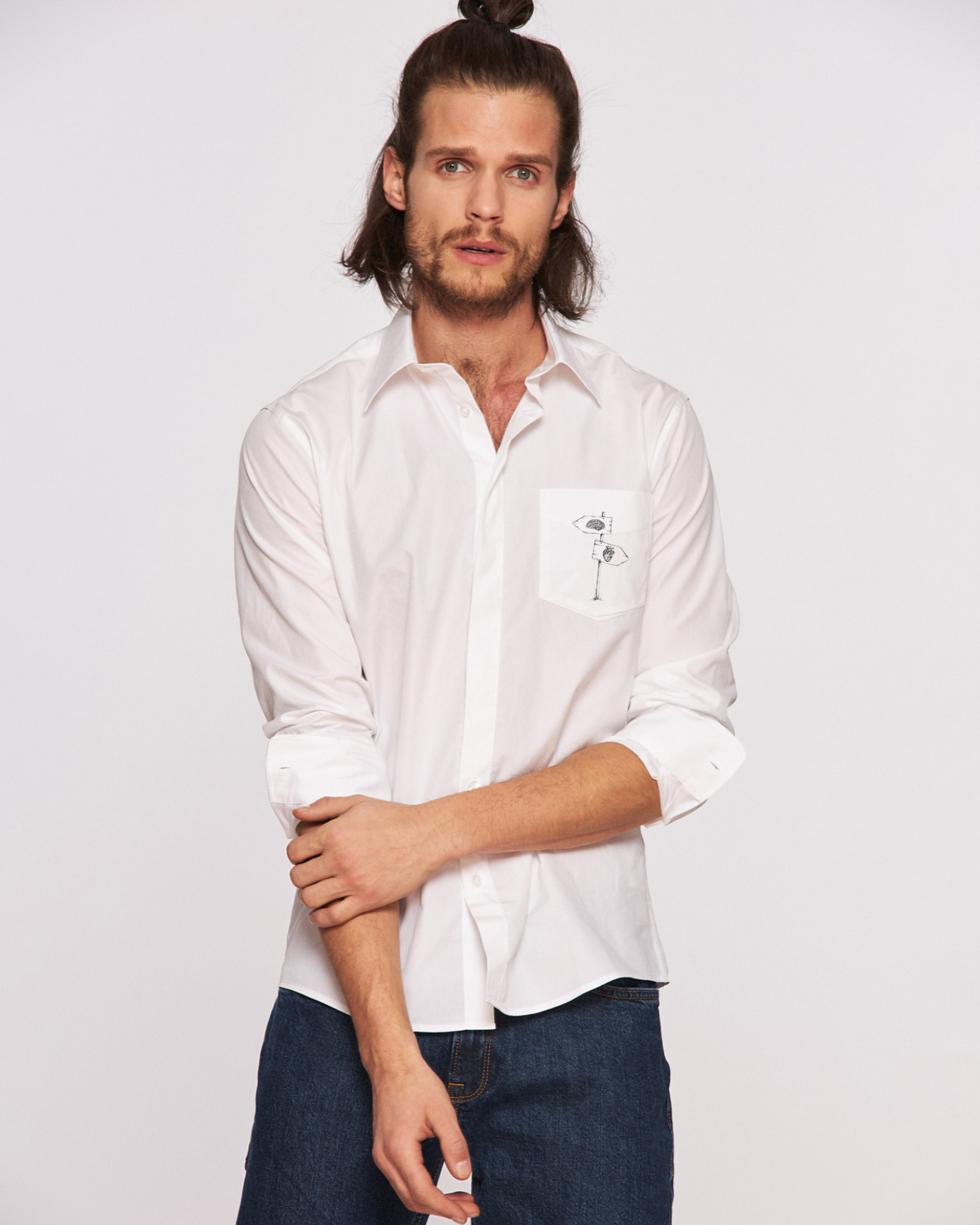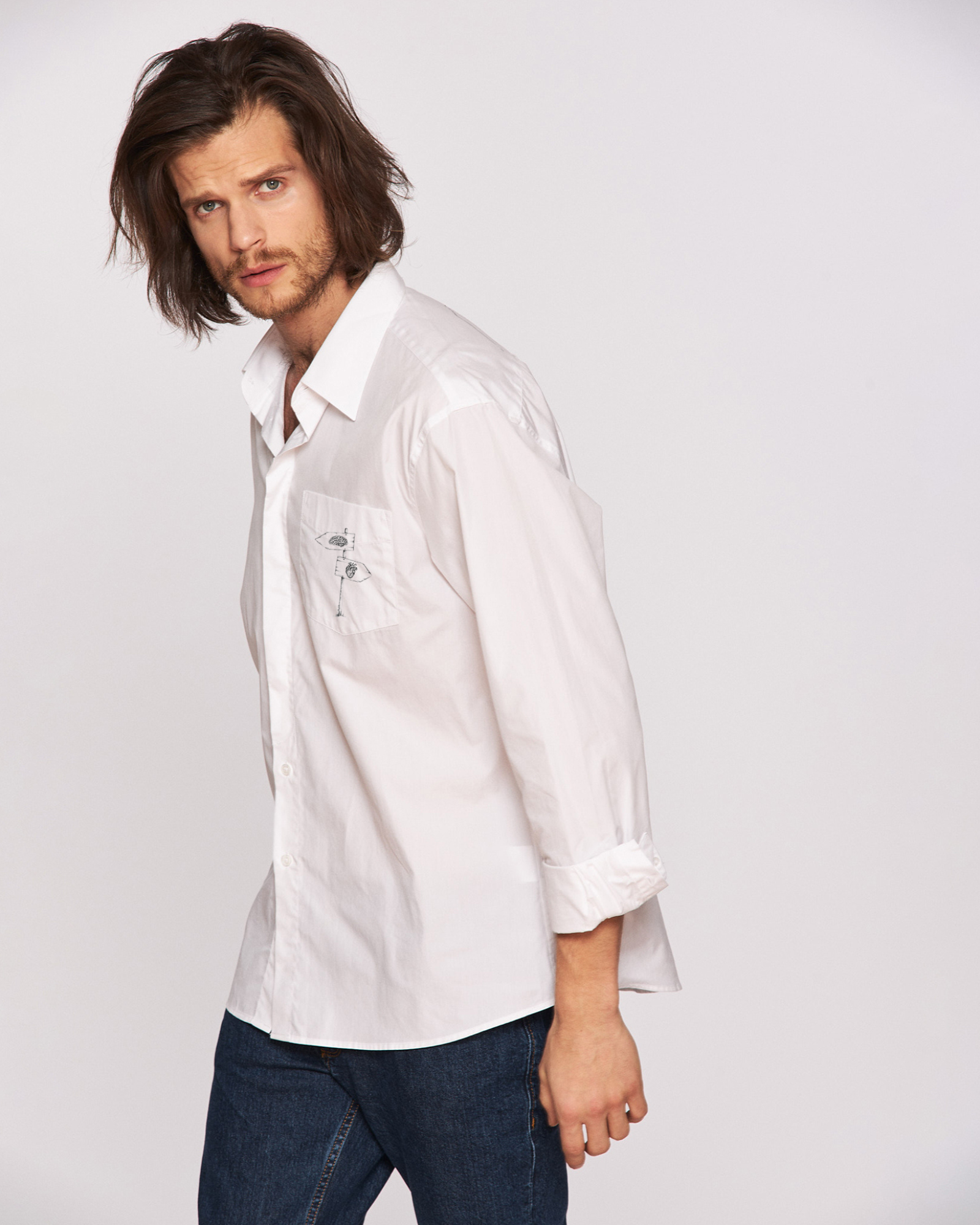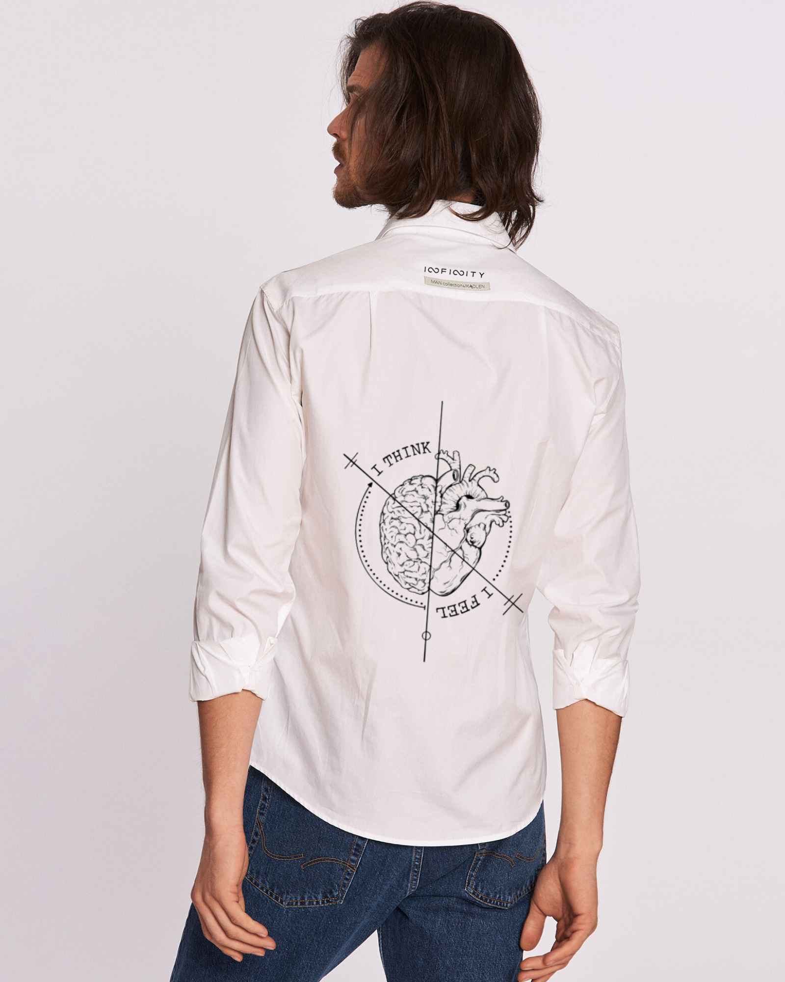Detaliile fac din această cămașă o piesă ideală pentru un aspect urban relaxat sau pentru ocazii informale, conferind un aer sofisticat și modern, totodată. Această cămașă masculină, fabricată din bumbac de înaltă calitate, are un croi lejer pentru a oferi confort și libertate de mișcare pe tot parcursul zilei. Designul său simplu și inovativ este completat de un detaliu distinctiv, modelul subtil de răscruce între inimă și creier plasat pe buzunarul din față, adăugând un aspect sofisticat. Spatele cămășii prezintă o legătură între cele menționate anterior, rezultând împăcarea dintre ele.