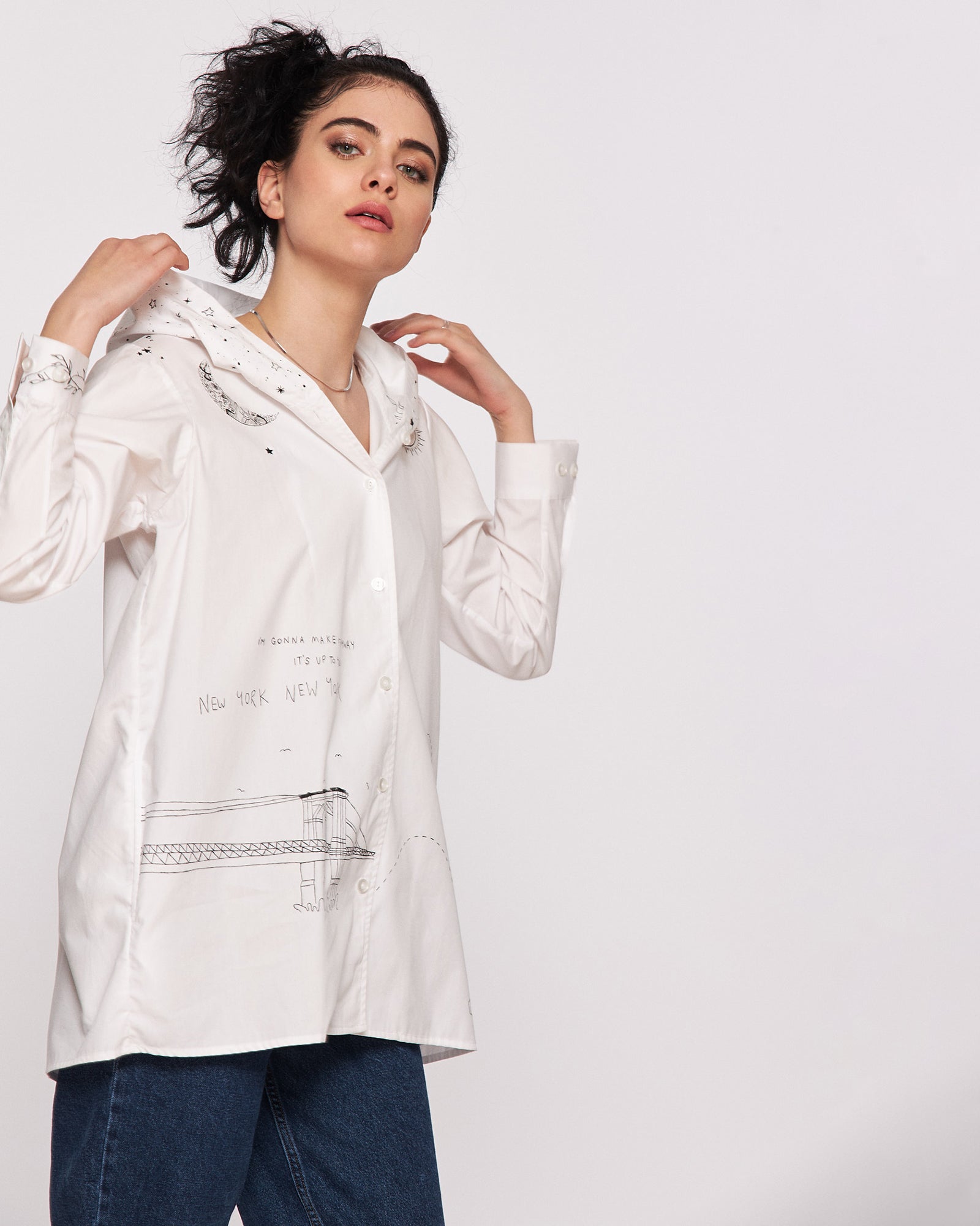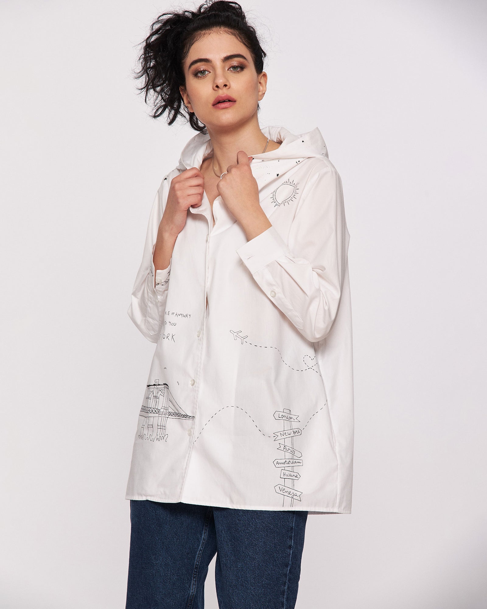Iți place să călătorești și iți dorești să ajungi la New York? If you can dream it, you can have it! Cămașa "Fly me to New York" este motivația perfectă pentru a-ți indeplinii visul. Modelul cu glugă poate fi purtat in cele mai diverse combinații atât de sine stătator ca o cămașă sau ca o jachetă pe deasupra unui top sau a unei rochite. Indiferent de cum alegi să o porți fii sigură că va da un aer fresh și sofisticat ținutei.