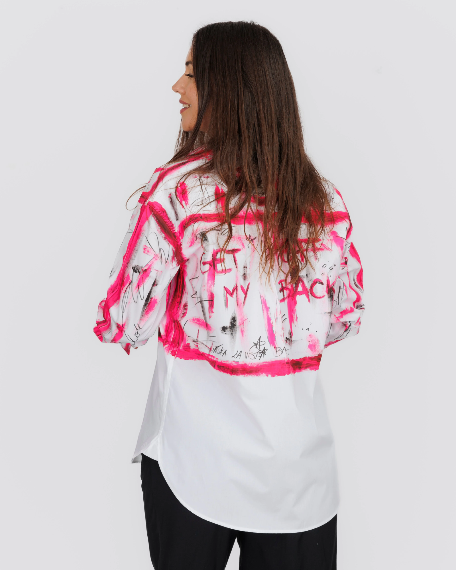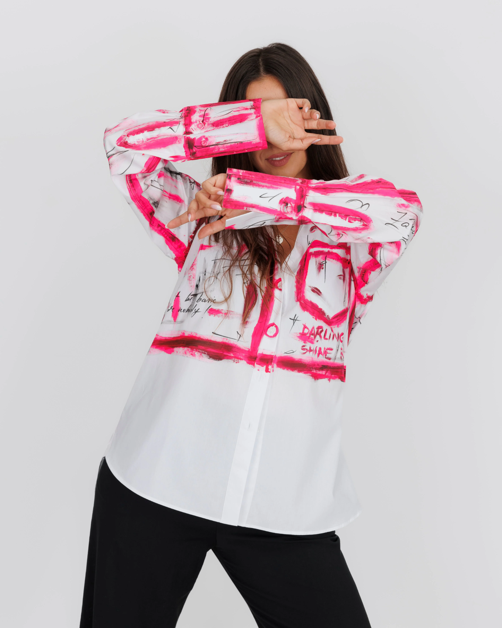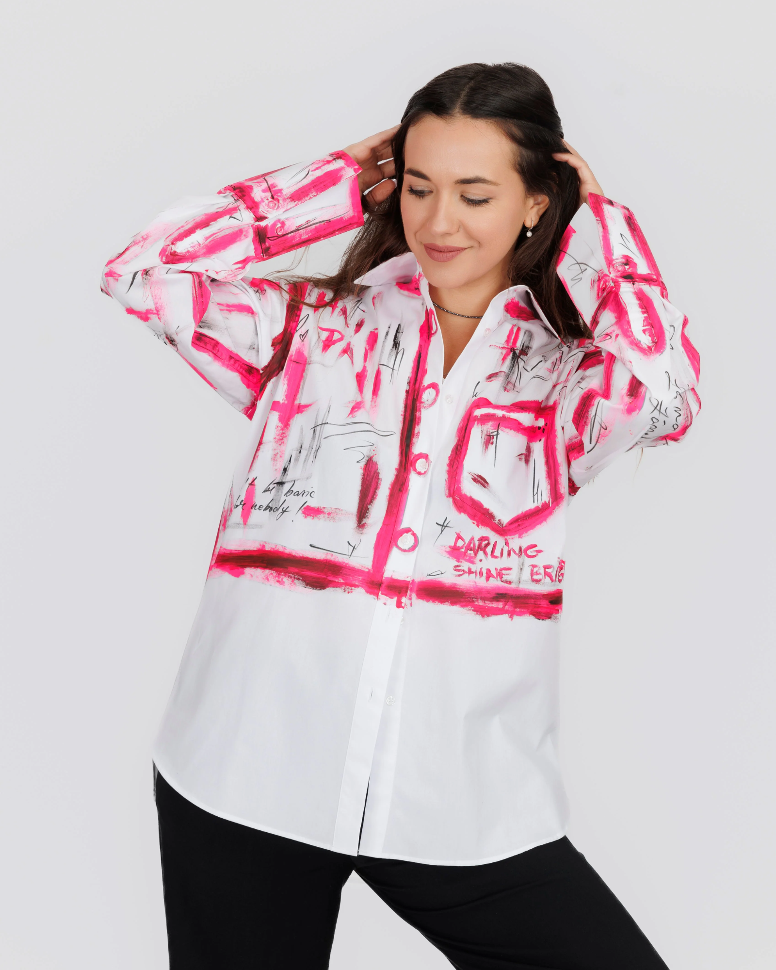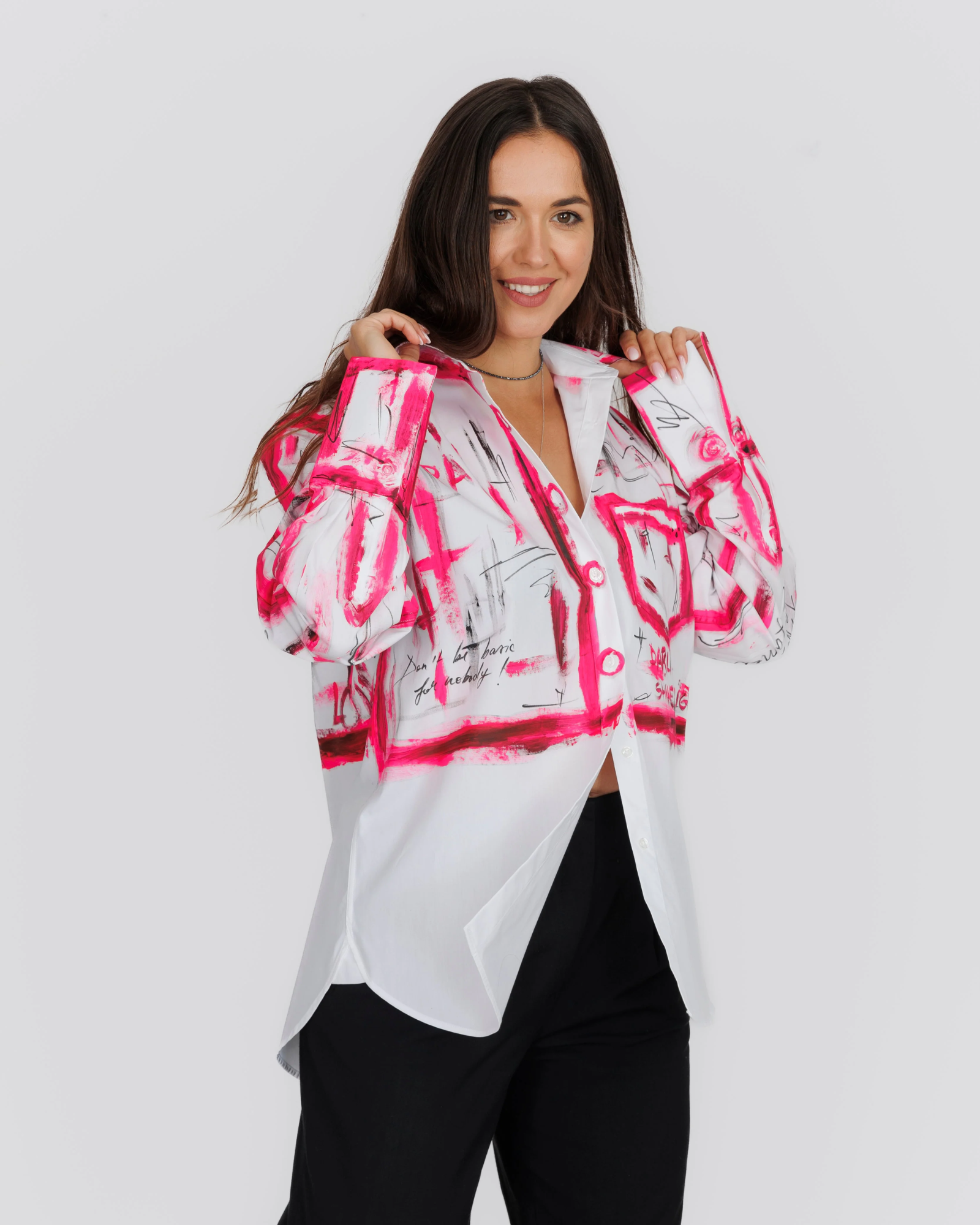Cămașa alba oversized pentru femei "Barbie World" model inspirat din filmul Barbie te va scoate din dilemă în zilele în care nu știi ce să porți dar esti pregatita sa iesi in evidenta. Fiind realizată din bumbac, îți va oferi confort și lejeritate în orice ținută ai alege să o integrezi. Imprimeul minimalist dar plin de semnificatie se va contopi cu usurinta cu vibe-ul pe care doresti sa il transmiti.