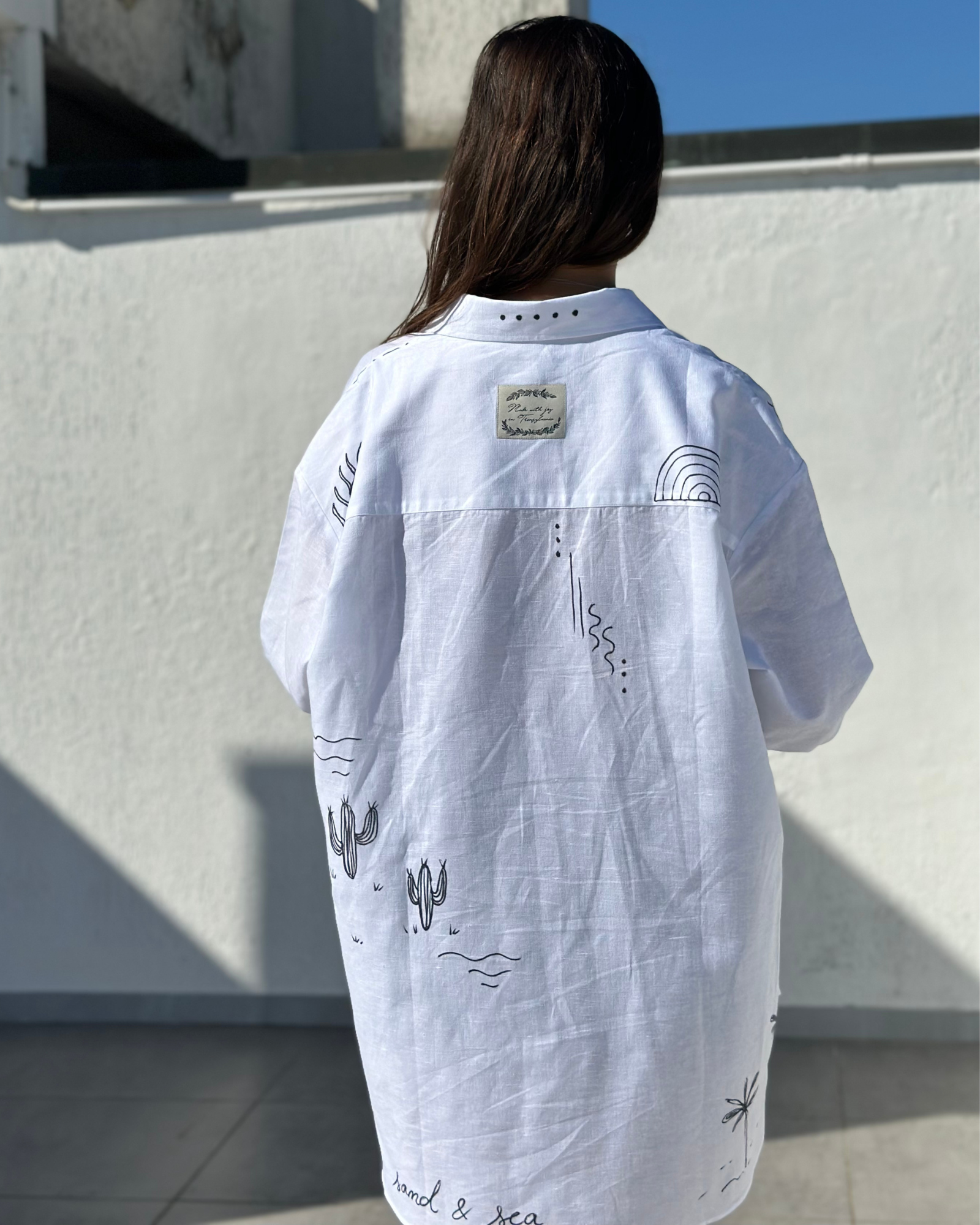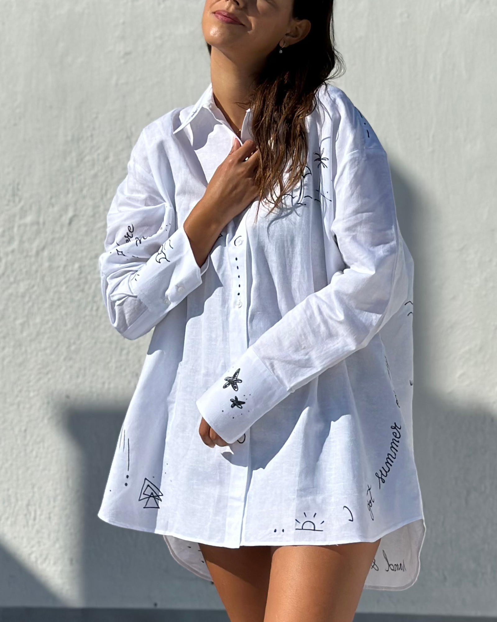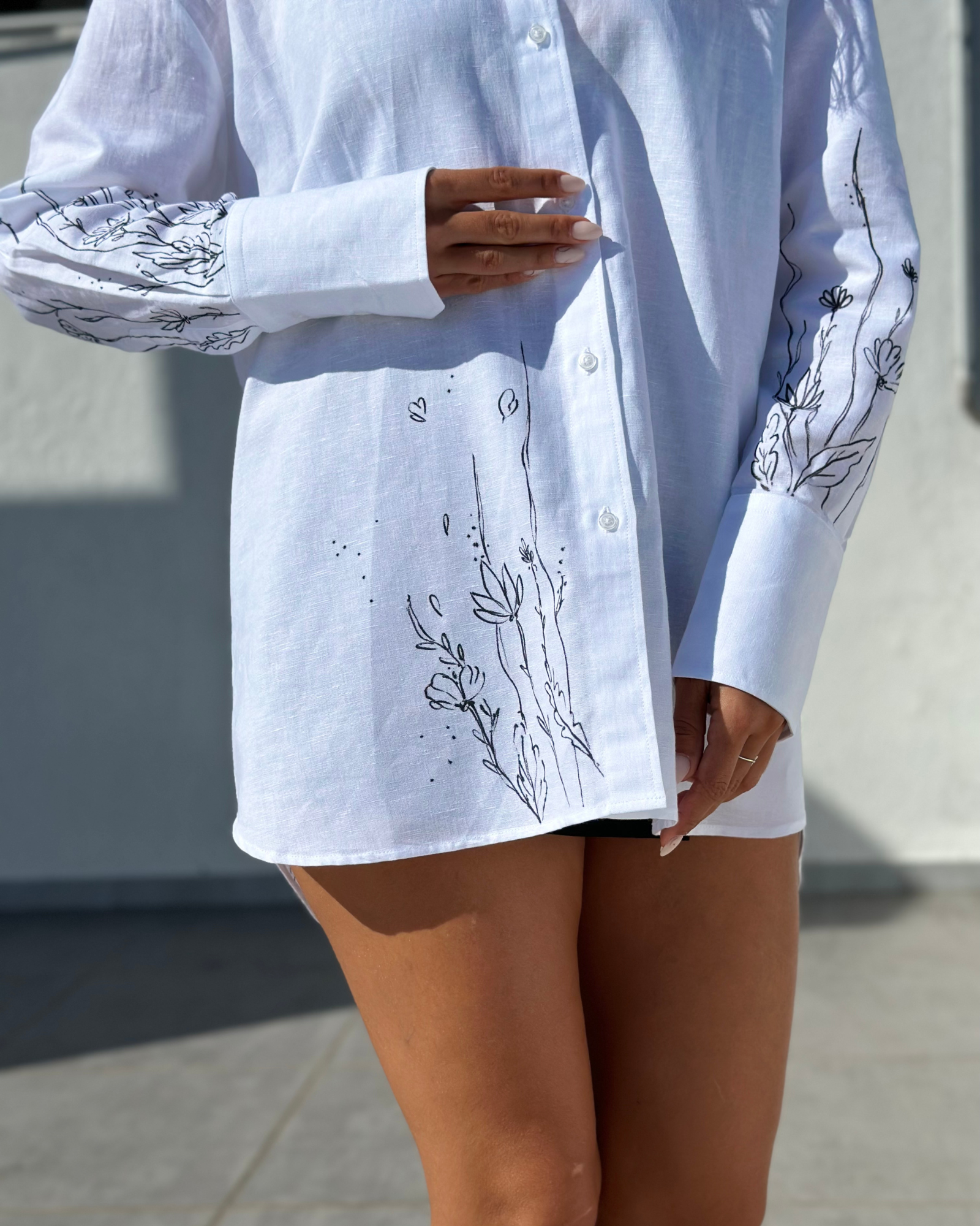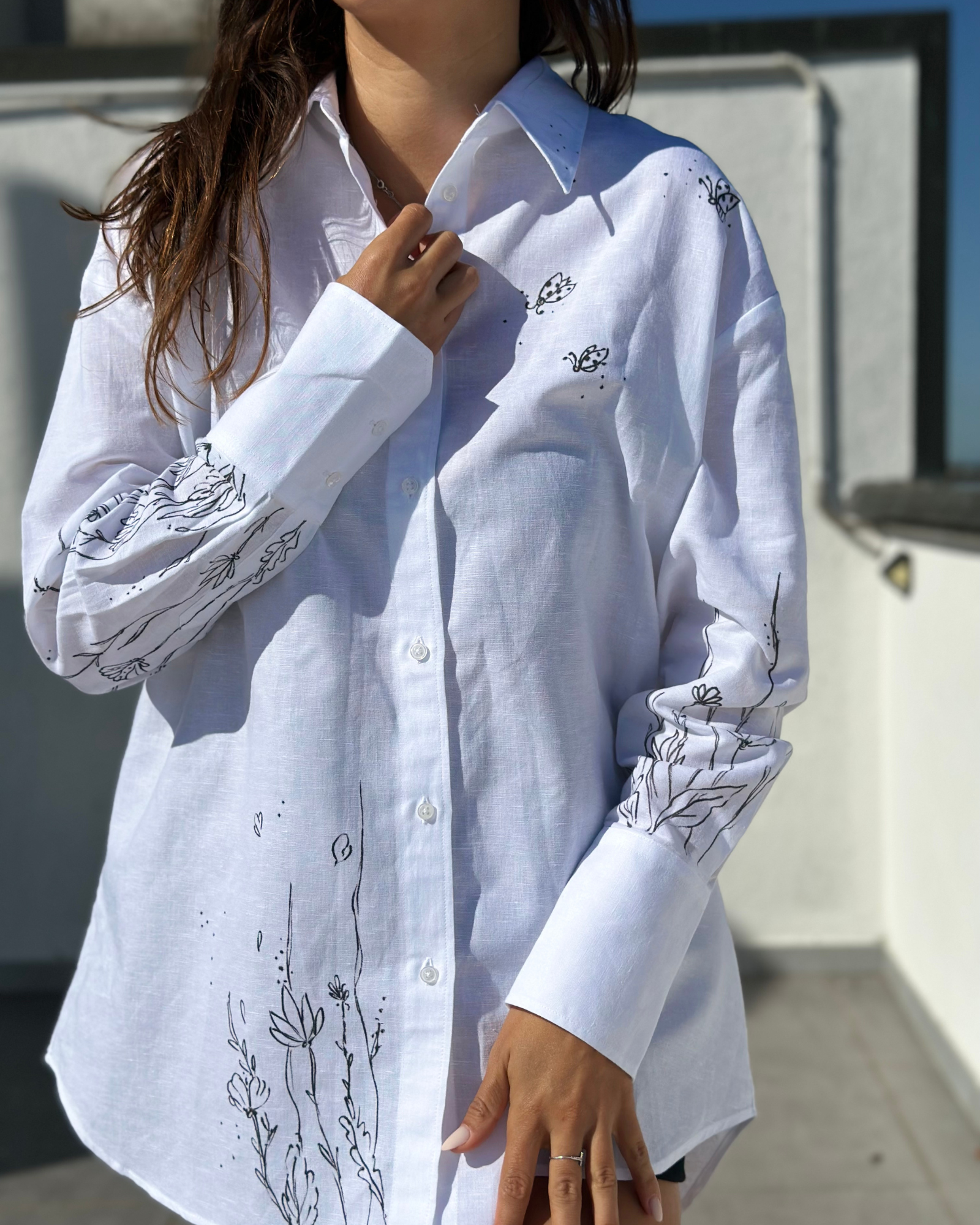 Cu acest design subtil și elegant, această cămașă oversized din in devine alegerea perfectă pentru a te simți proaspătă și sofisticată în timpul verii. Pe fundalul luminos din in, veți găsi conturate cu finețe flori delicate, simbolizând natura în toată splendoarea ei. Aceste flori aduc o notă de feminitate și delicatețe, perfectă pentru sezonul cald. Soarele, reprezentat într-un stil minimalist, strălucește ca un simbol al optimismului și energiei verii. Fluturii, cu aripile lor grațioase, adaugă o notă de jucăușie și ușurință, sugerând libertatea și zborul spre noi aventuri. Cu ajutorul acestei cămăși, ești pregătită să îmbraci un stil minimalist și rafinat care să reflecte natura și frumusețea.