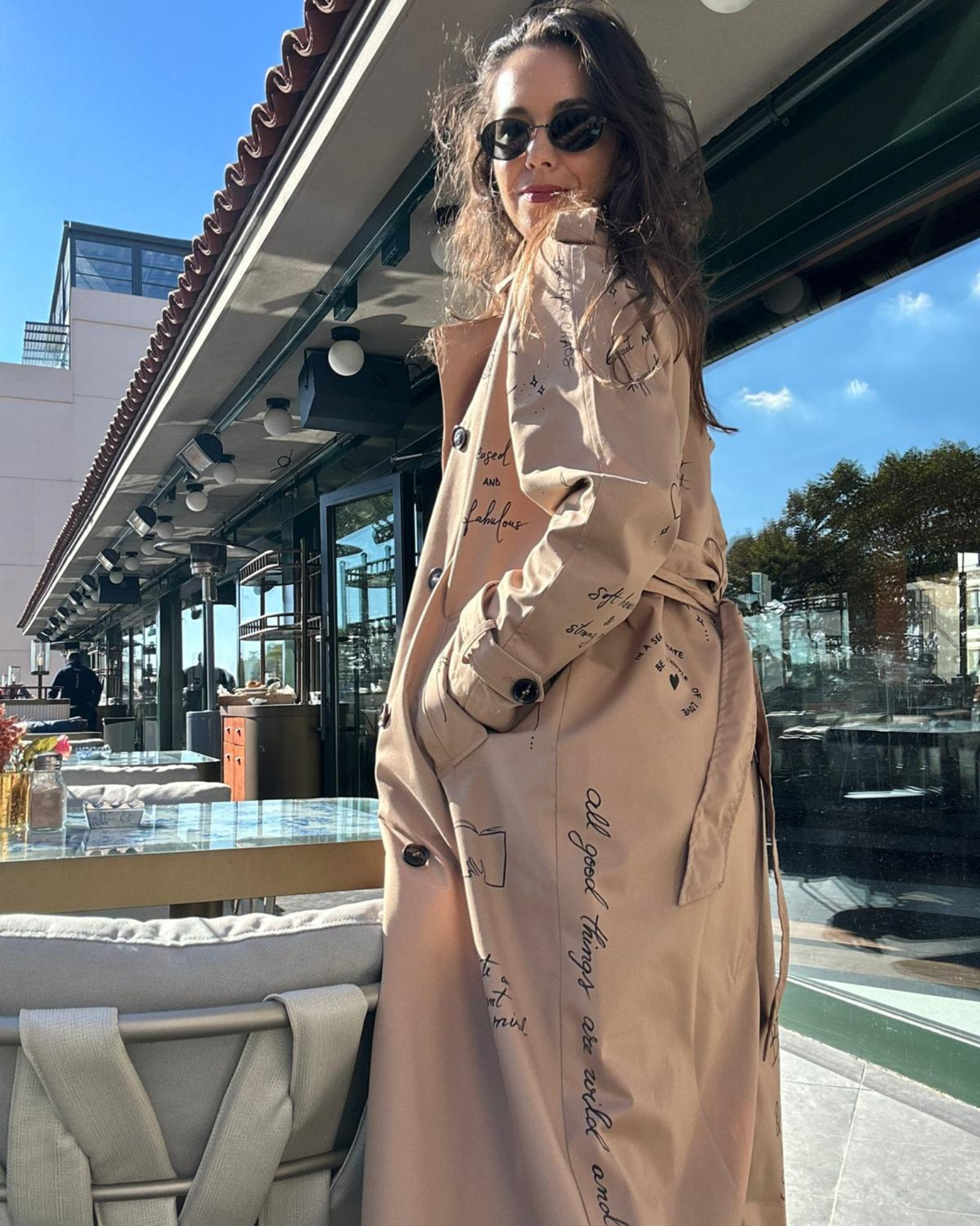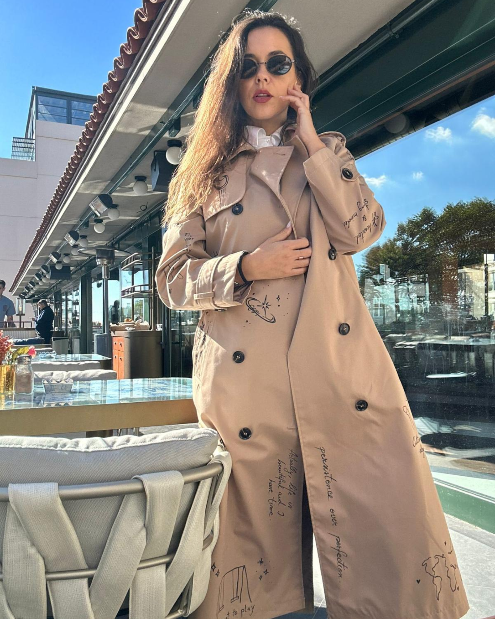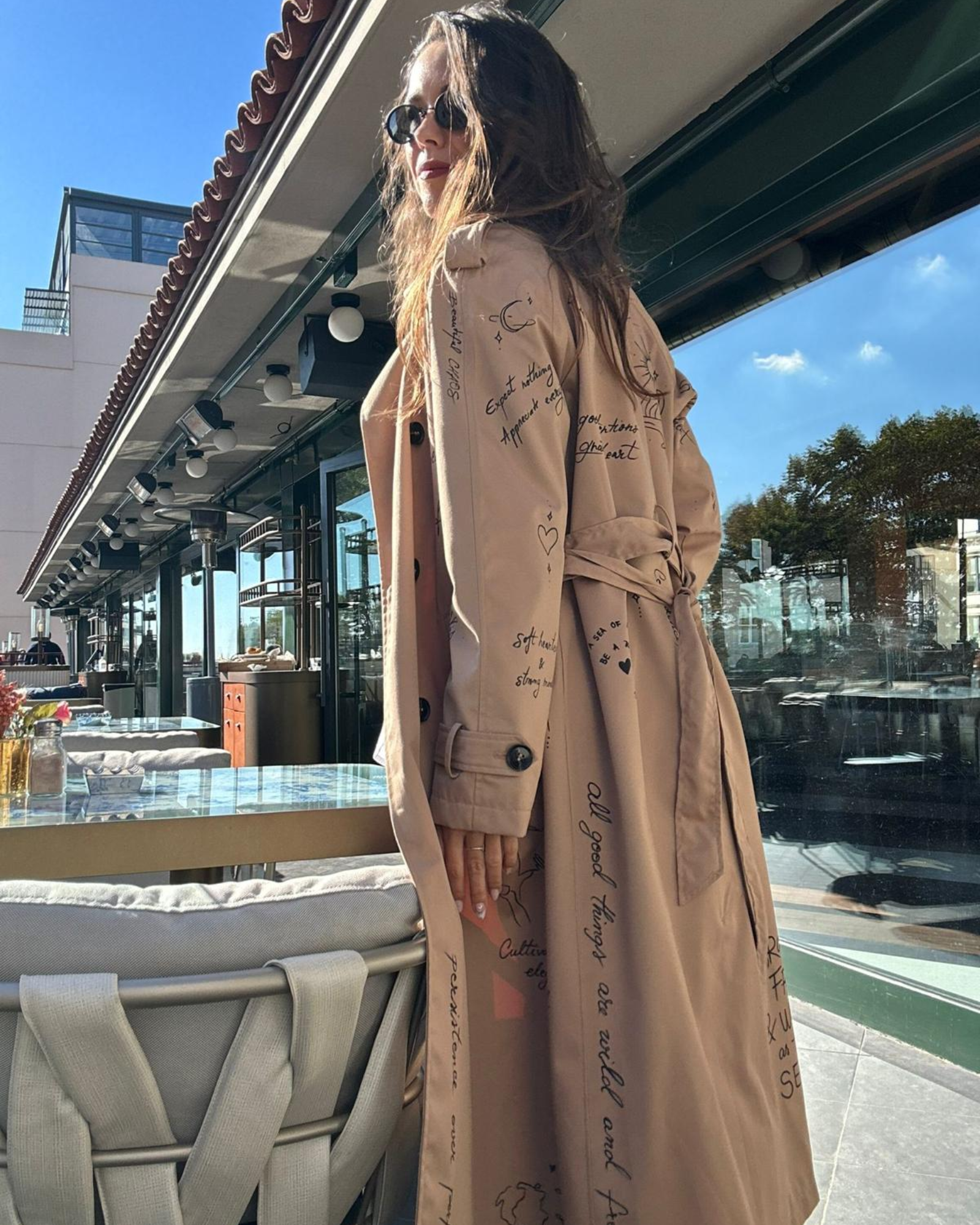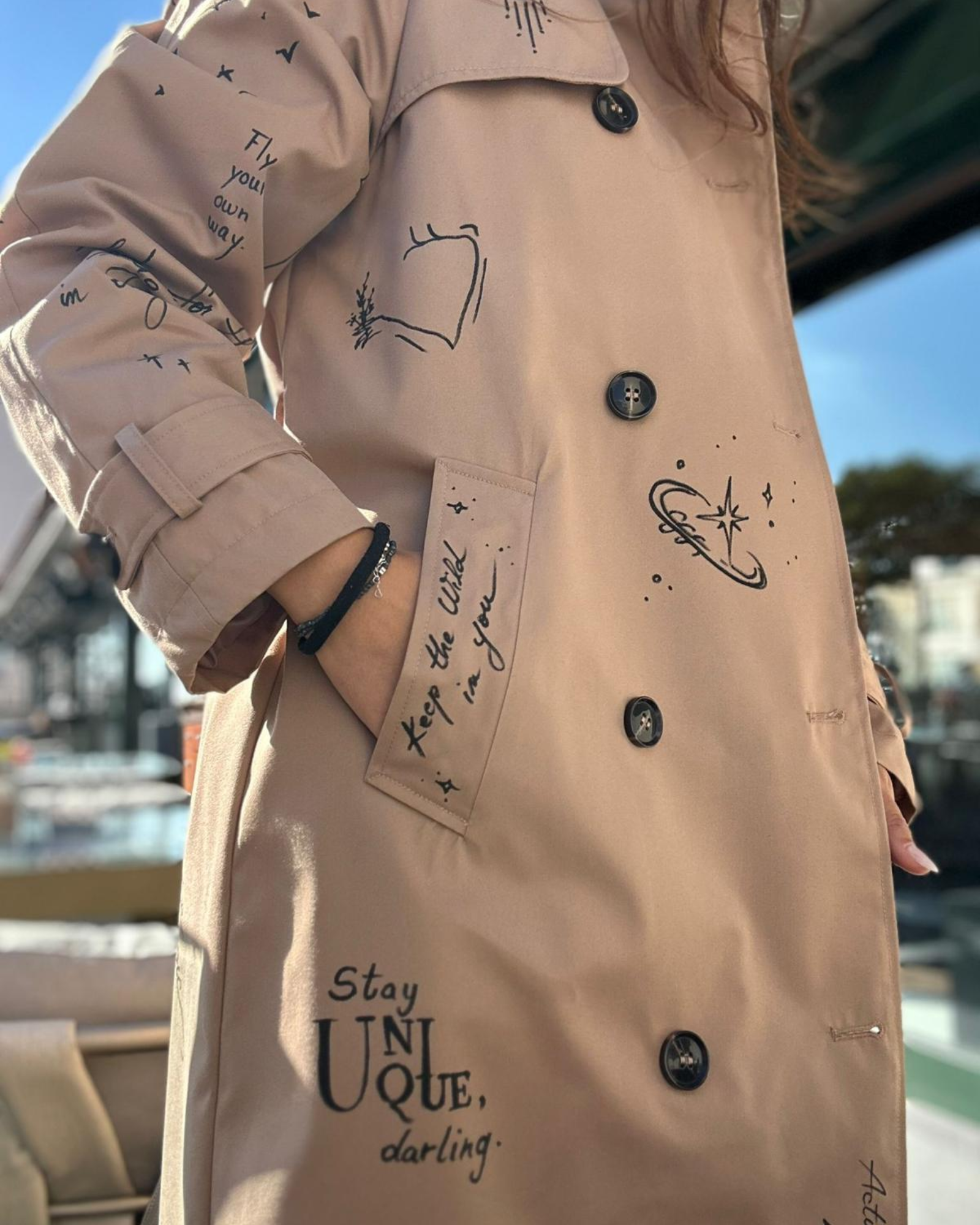 Descoperă eleganța rafinată și personalitatea distinctivă a paltonului nostru maro-cappuccino, confecționat dintr-un material lejer și ușor, oferindu-ți confortul ideal în orice sezon. Designul său versatil îți permite să îl integrezi cu ușurință în orice ținută, fie că este vorba de o zi la birou sau de o seară în oraș. Cuvintele care alternează simboluri și ilustrații minimaliste sunt aranjate cu atenție pe întreaga suprafață a paltonului, astfel adaugă un caracter jucaus și nonconformist, reflectând atitudinea ta energică și plină de viață. Fie că alegi să adaugi cuvinte inspiraționale, motive artistice sau mesaje personale, acest palton devine un canvas al identității tale.
