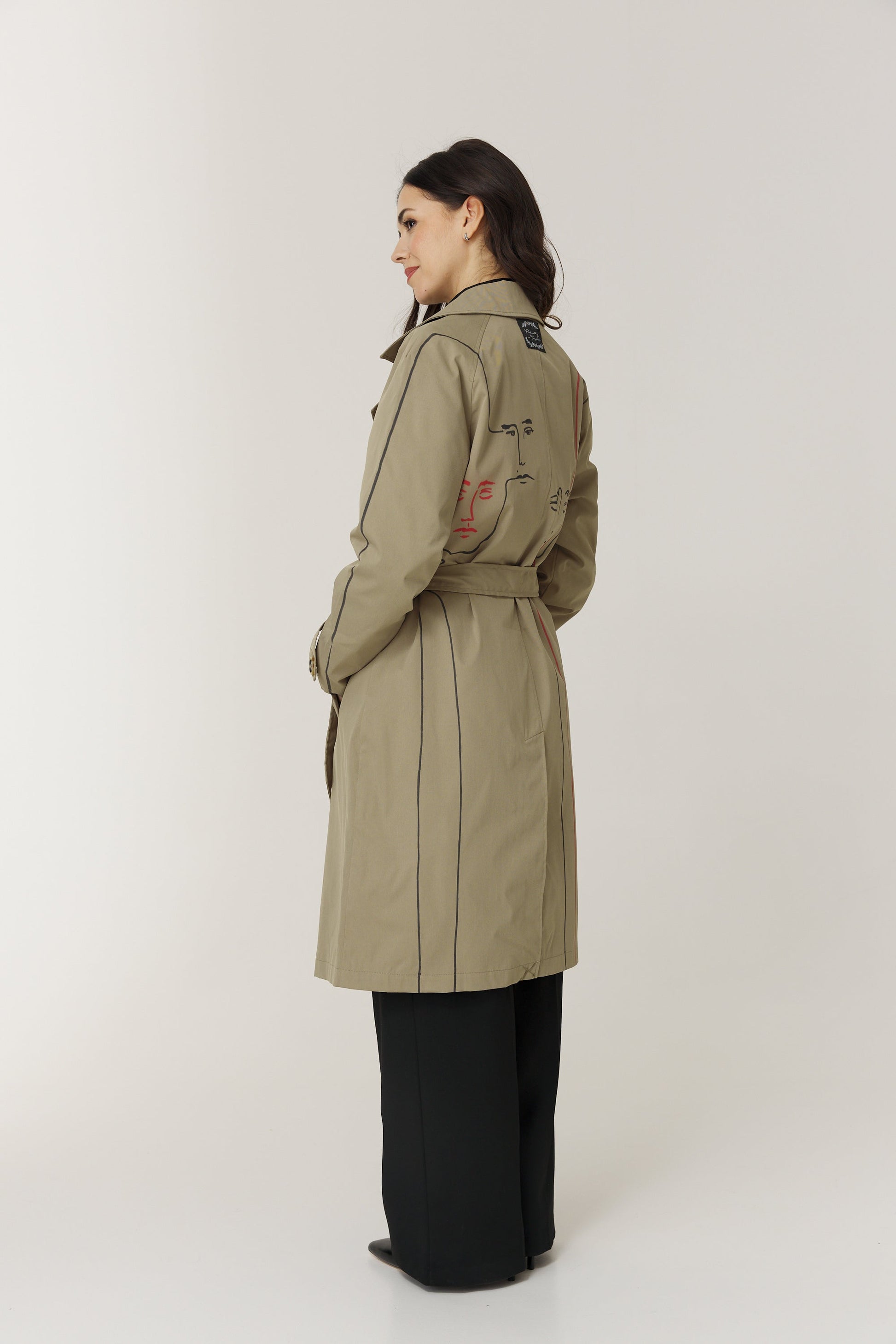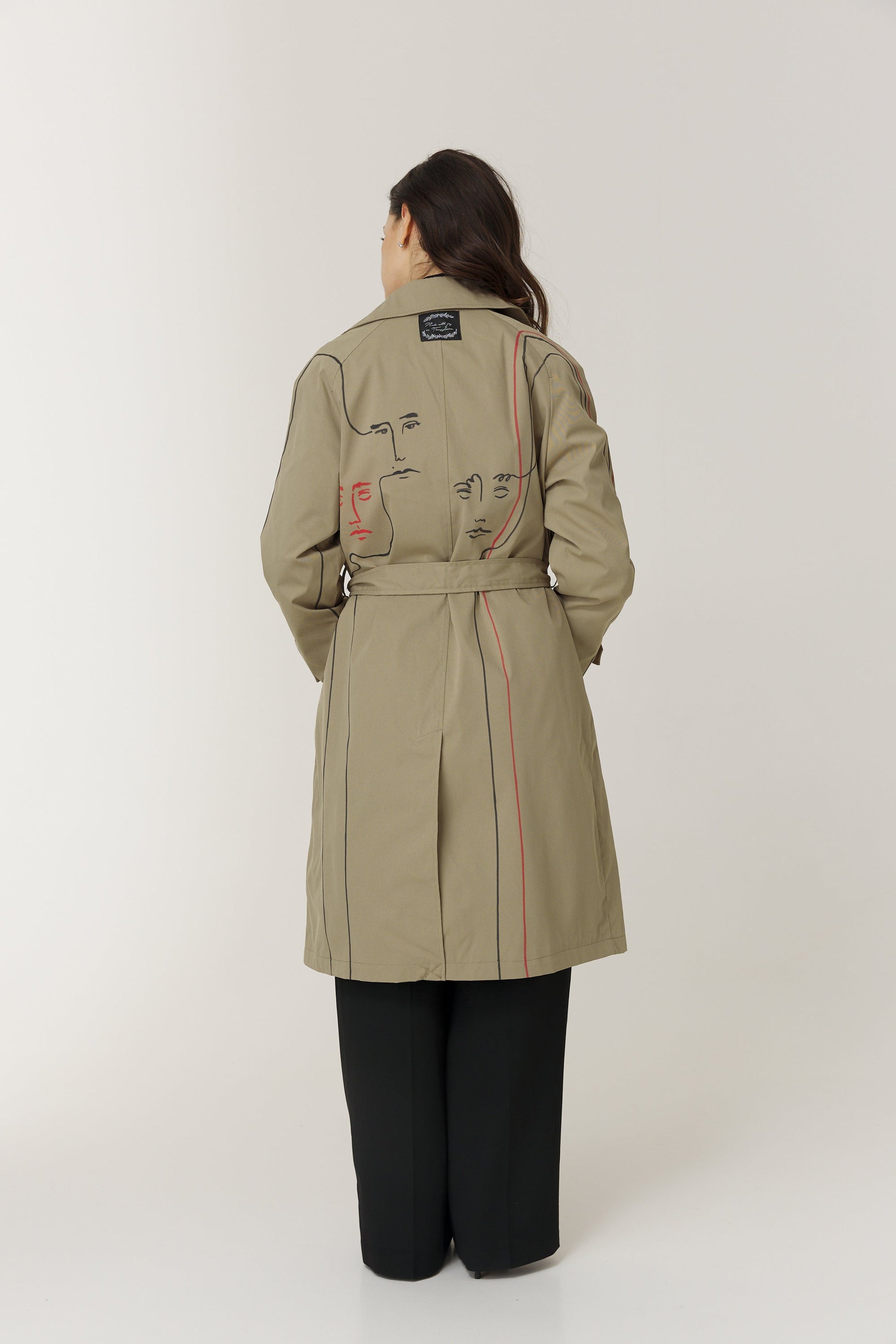Elevate your style with this unique short trench coat adorned with three hand-painted faces. Crafted with attention to detail, this statement piece features a classic silhouette with modern artistic flair. The meticulously painted faces add a touch of whimsy and individuality to the timeless design. Perfect for adding a pop of personality to any outfit, this trench coat is sure to turn heads and spark conversations wherever you go.